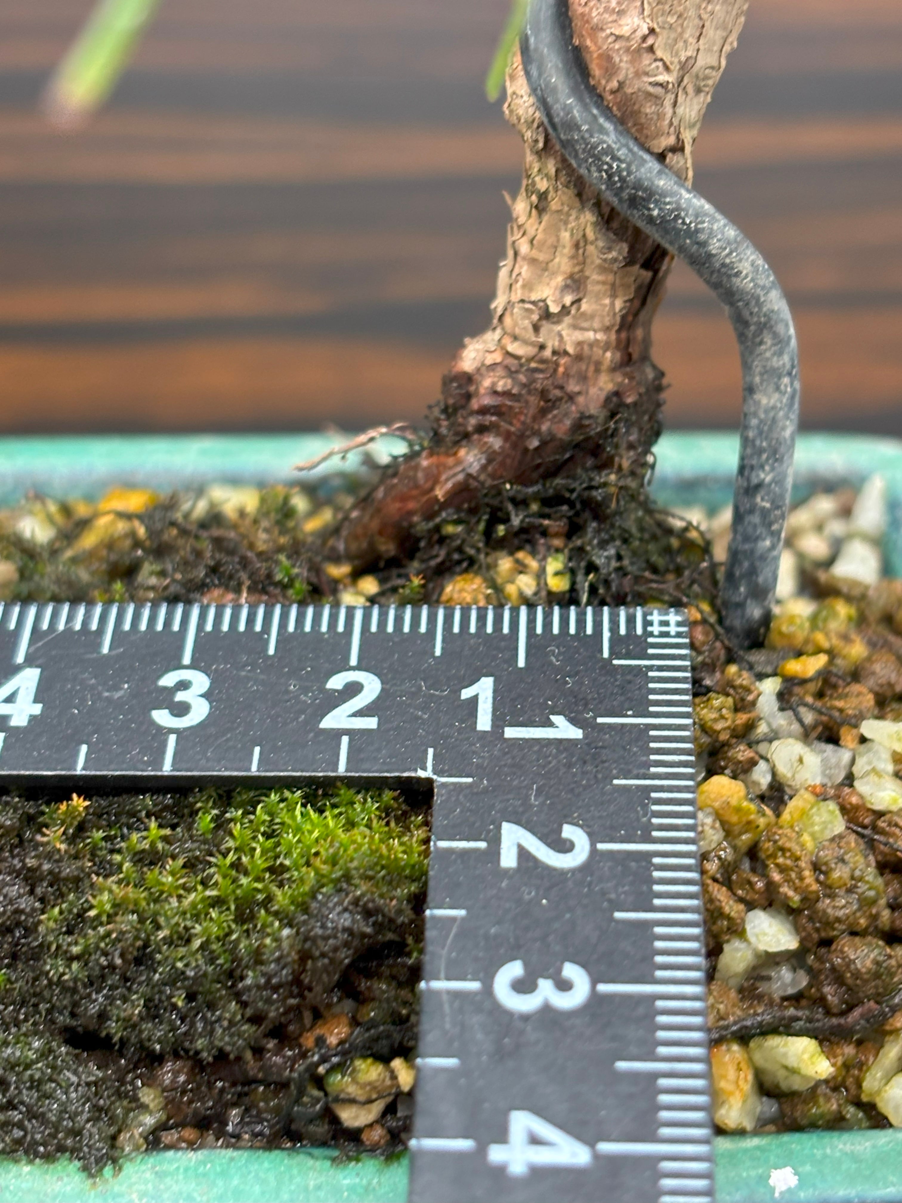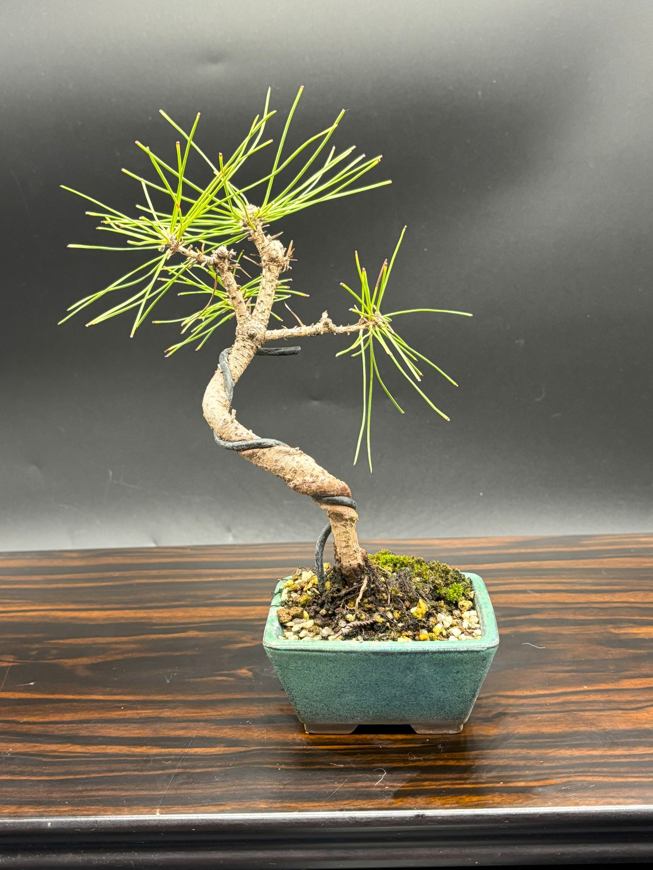 細長い針状の葉を持つ黒松の盆栽、曲がり幹が特徴的です。
