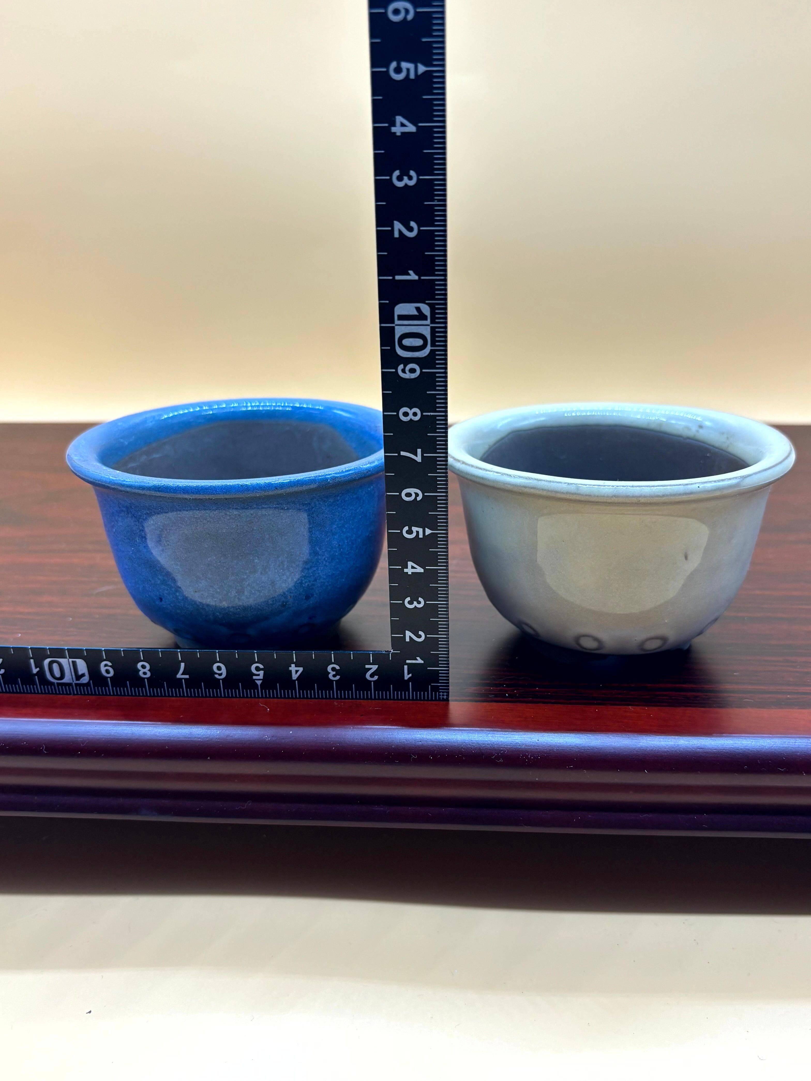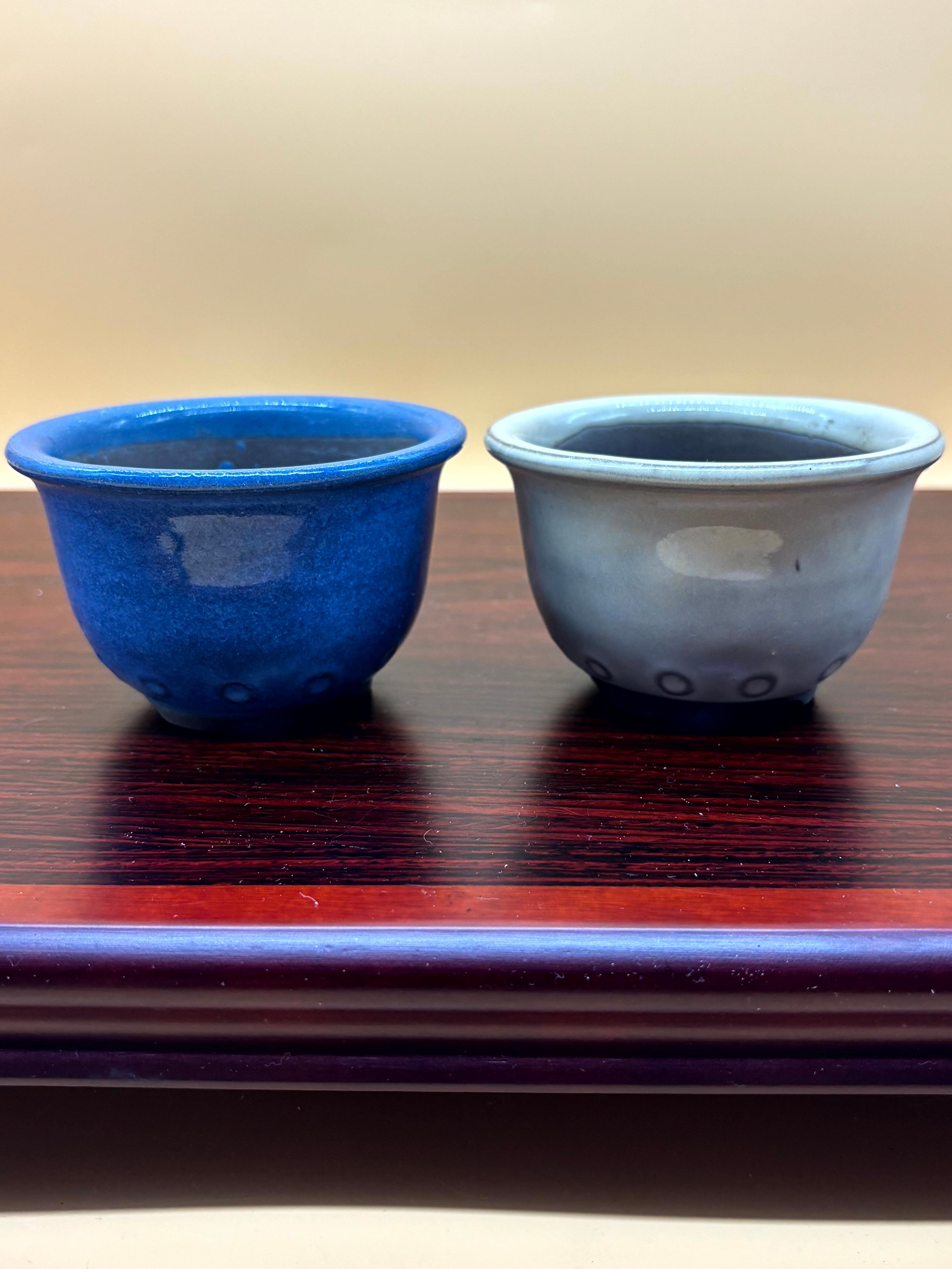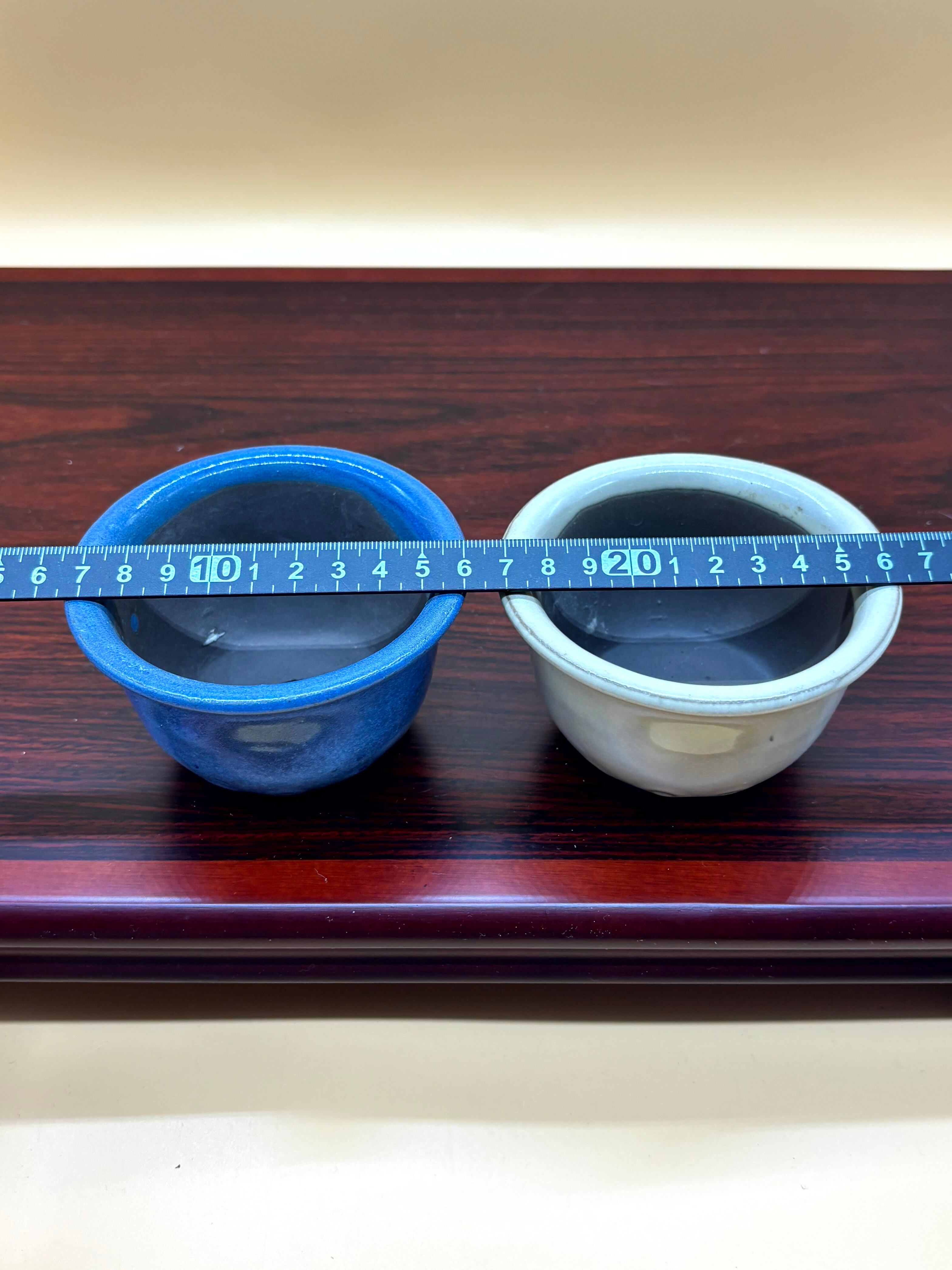 青とクリーム色の陶器製の小型鉢、底に穴あり。