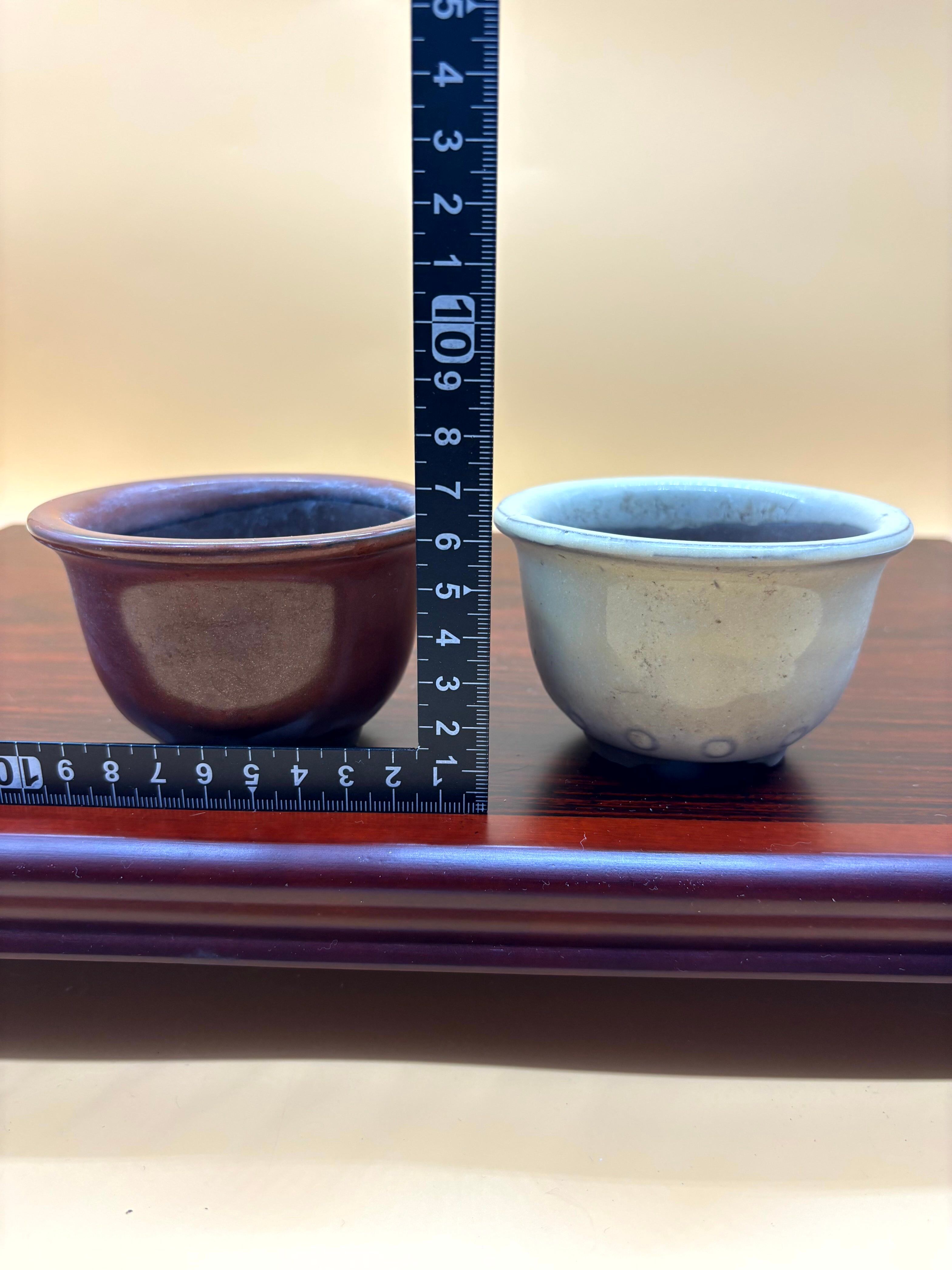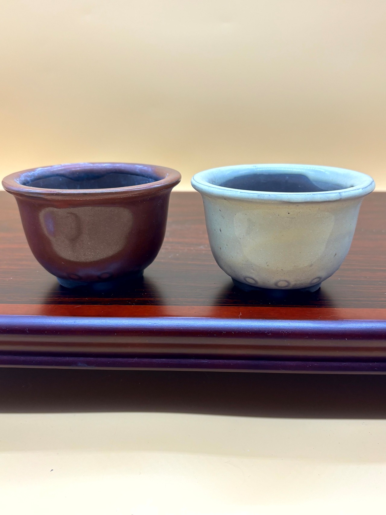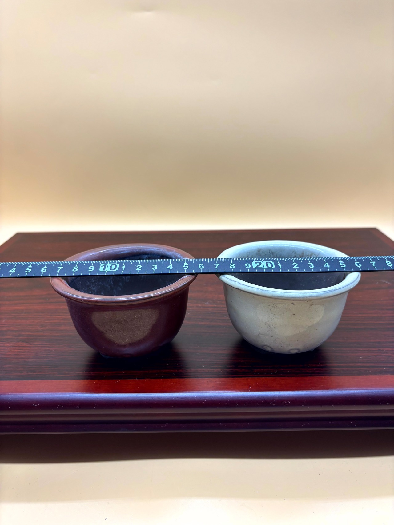 赤色と白の陶器製小型盆栽鉢、底穴あり。