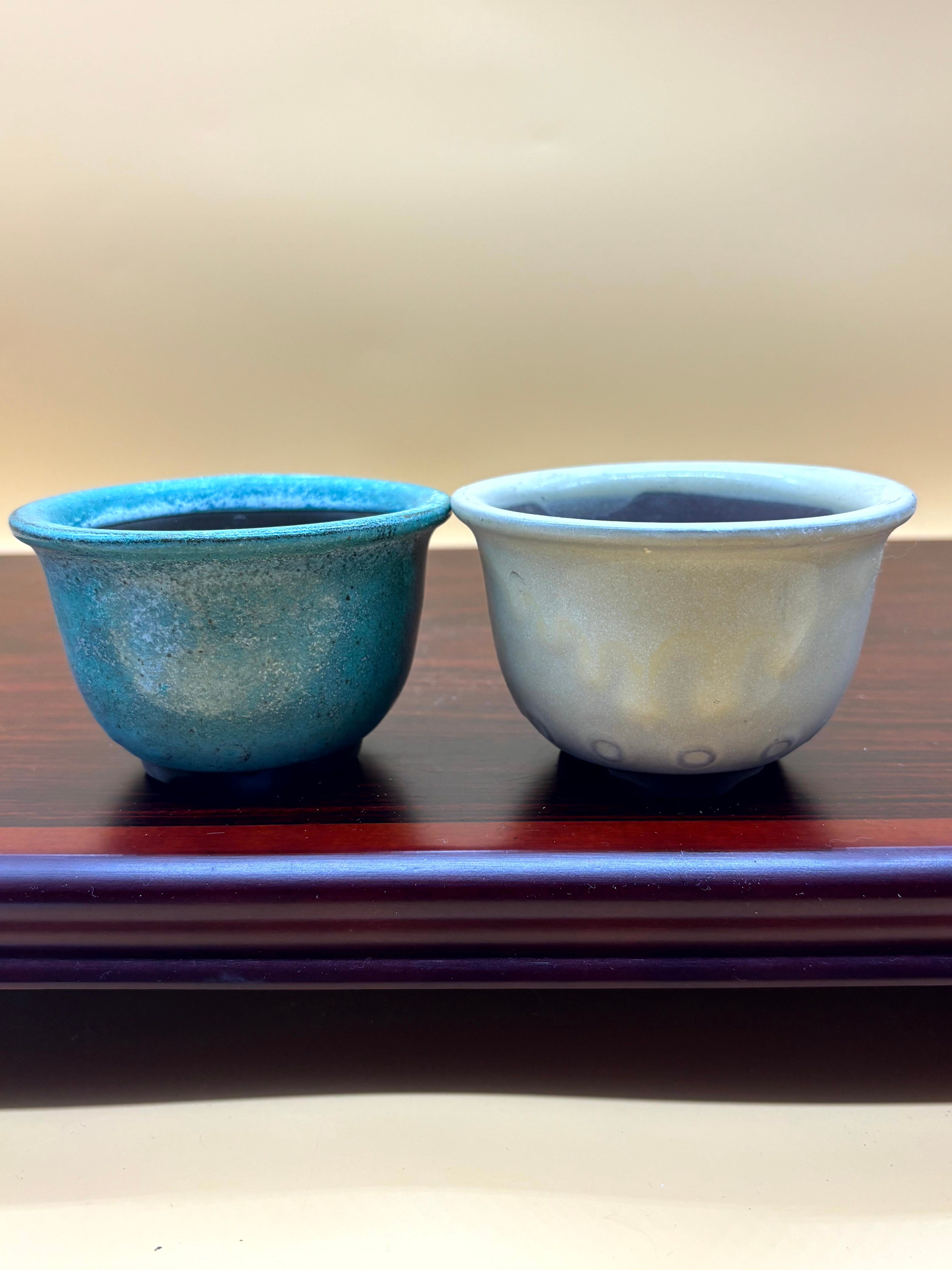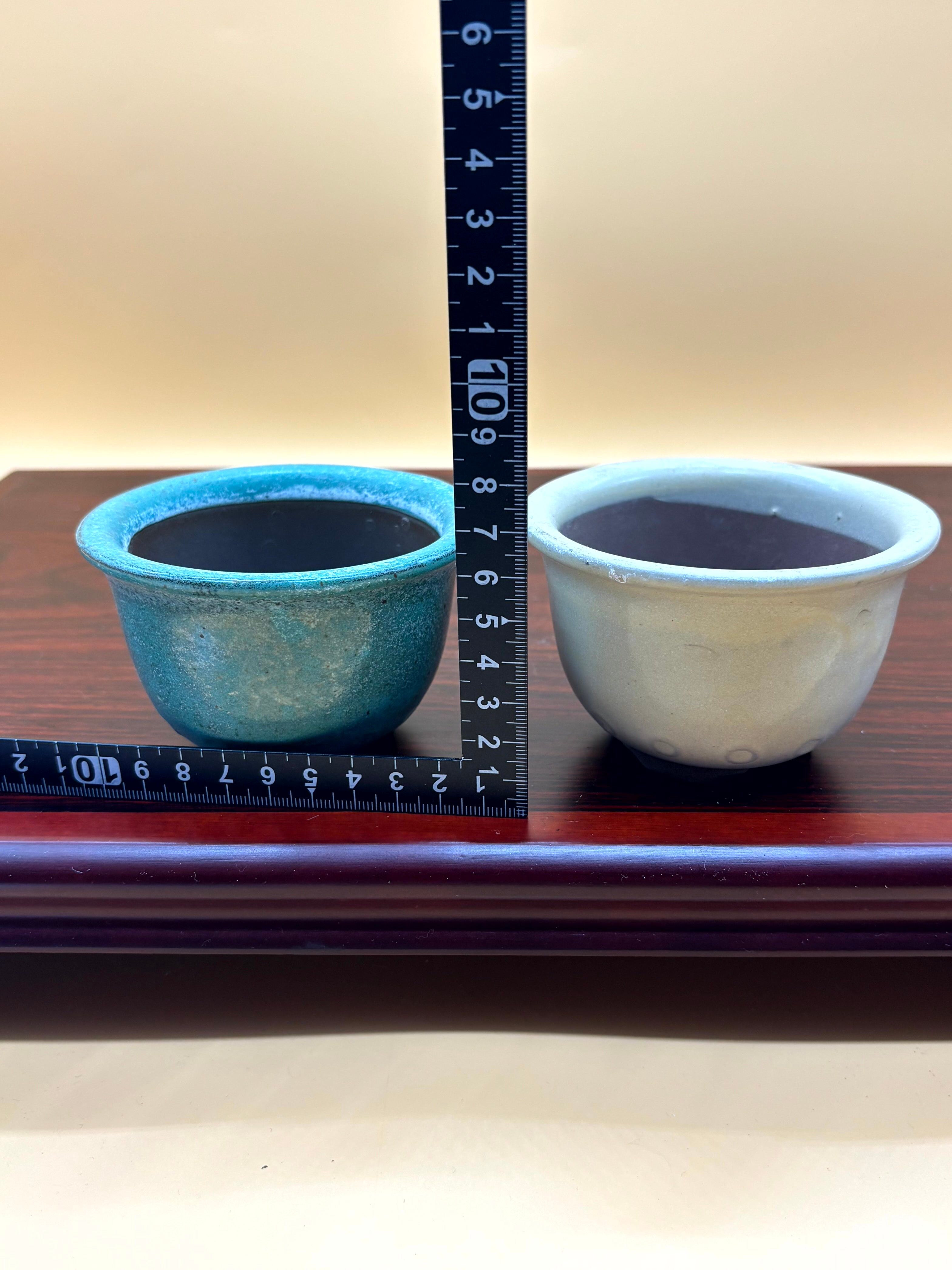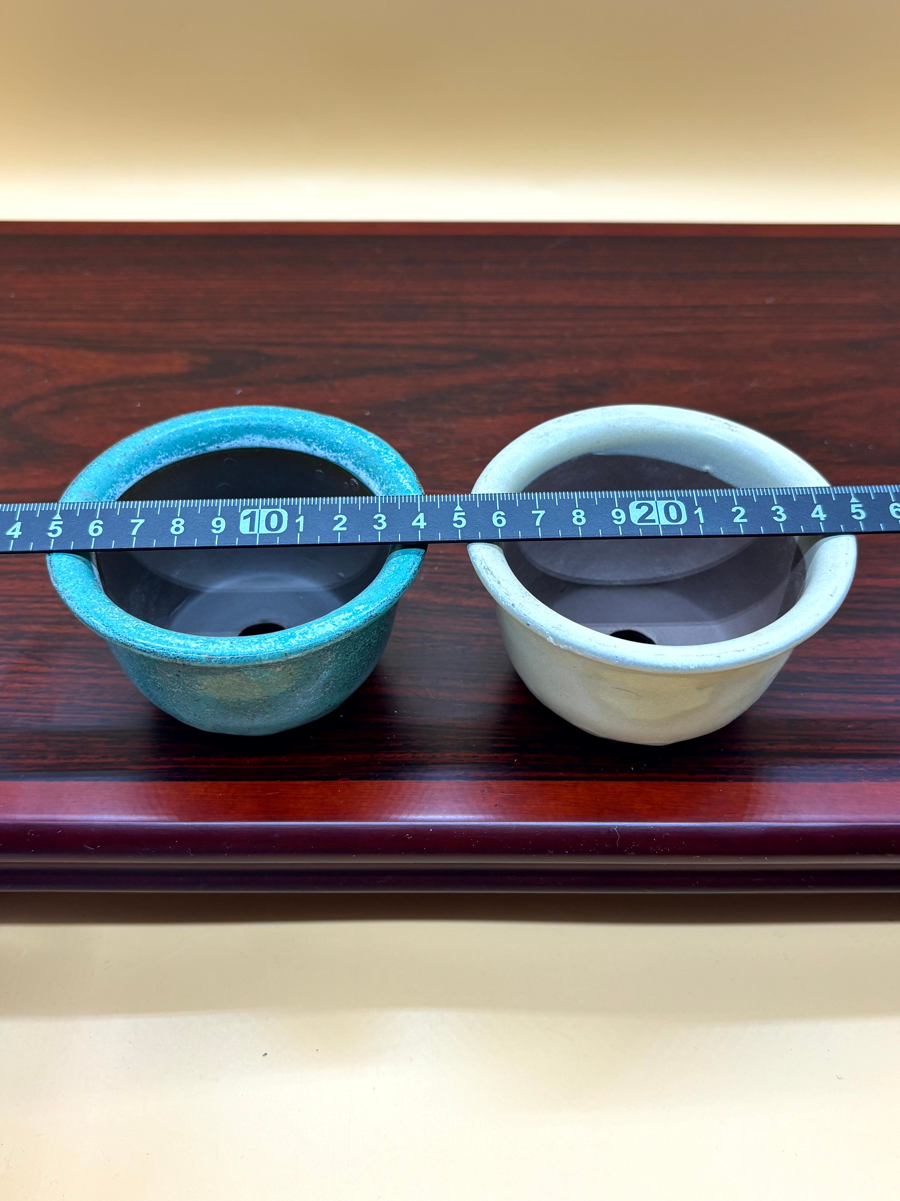 緑色とクリーム色の陶器製の小型盆栽鉢2個セット。