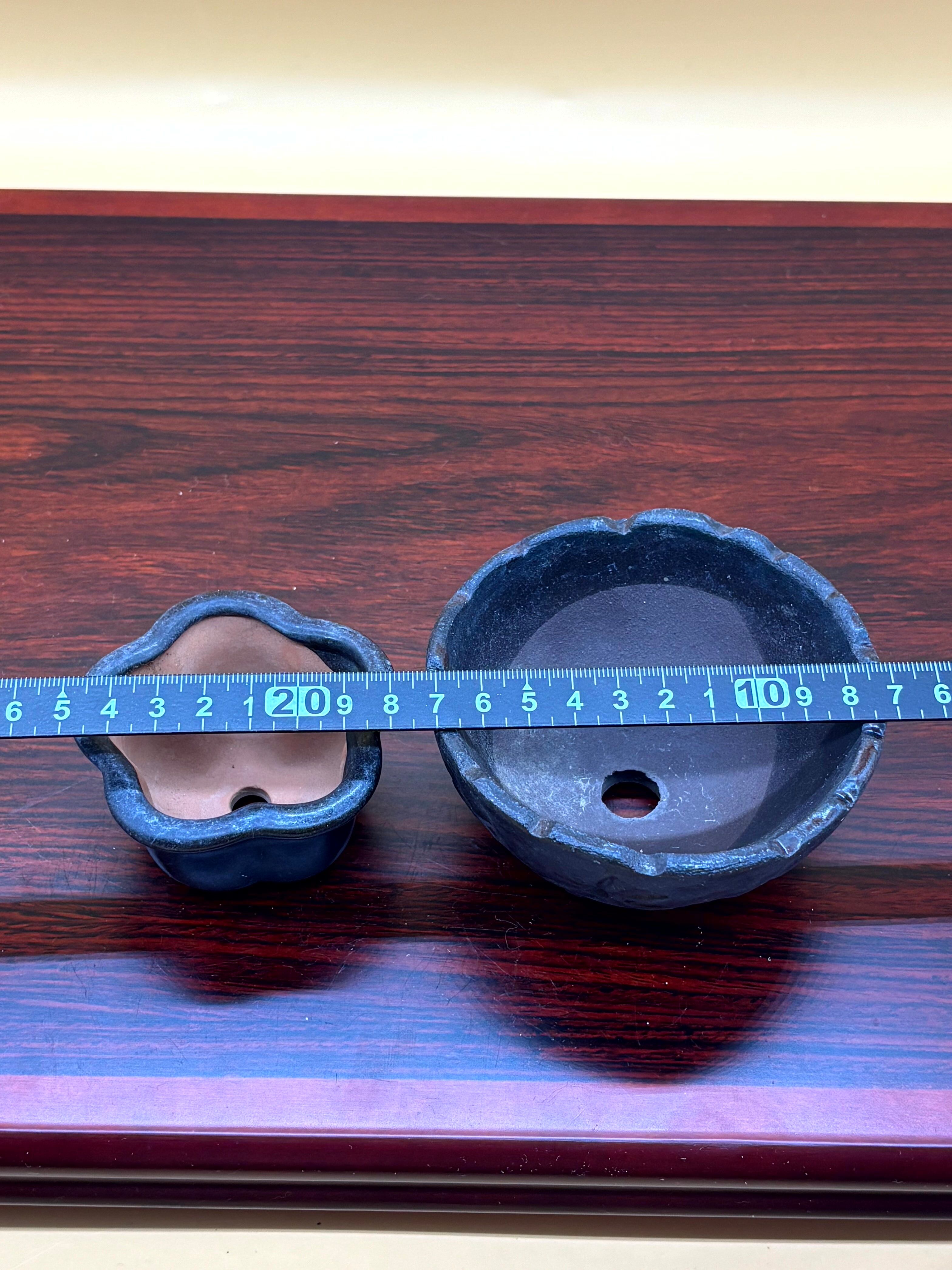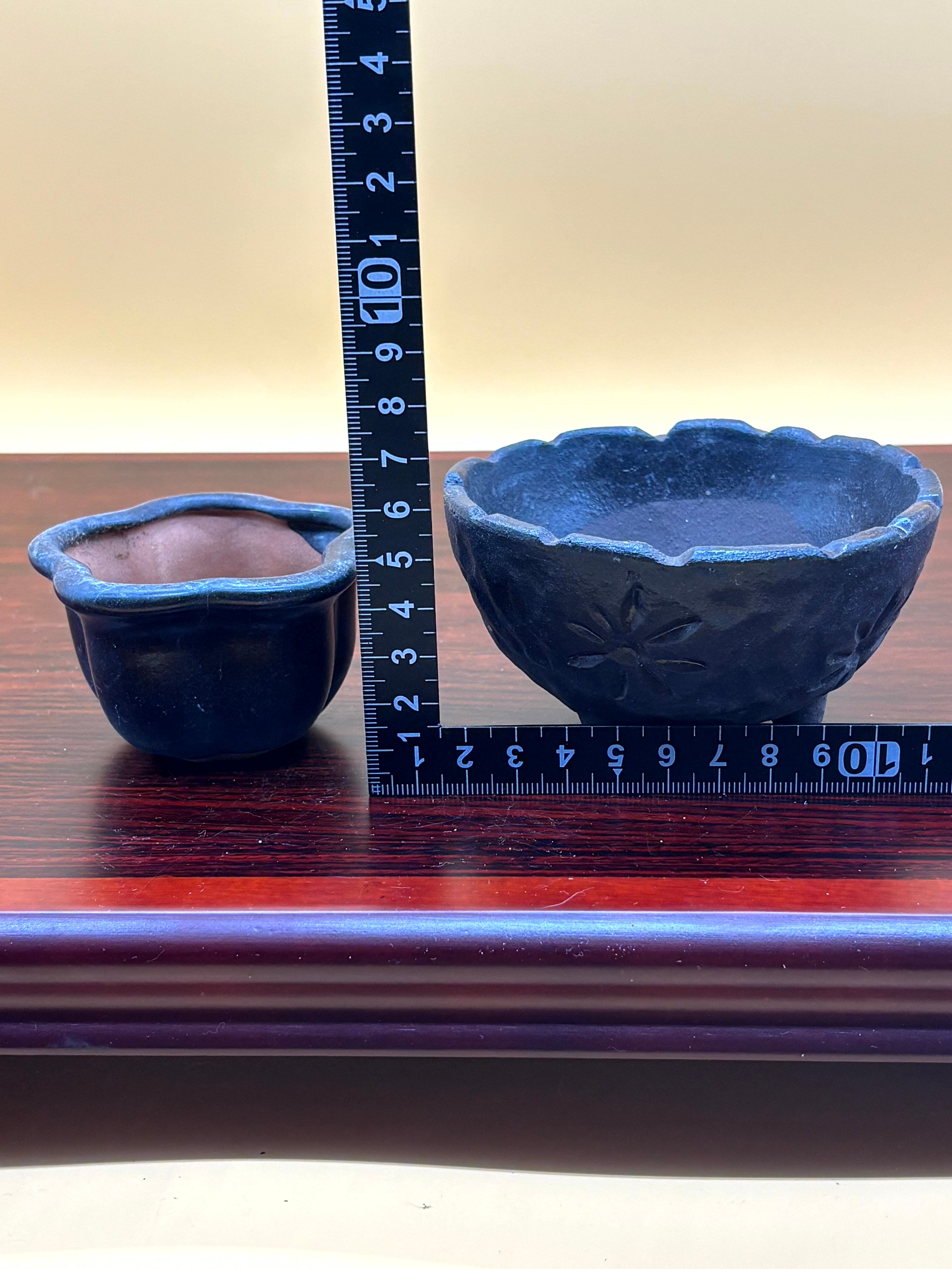 黒色の花模様が施された小型盆栽鉢2点セット。