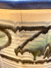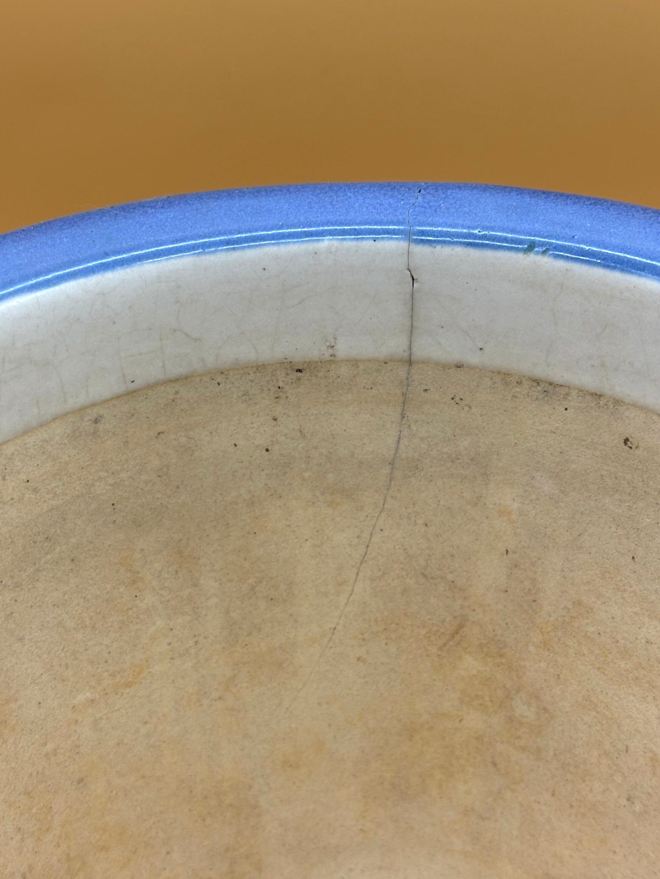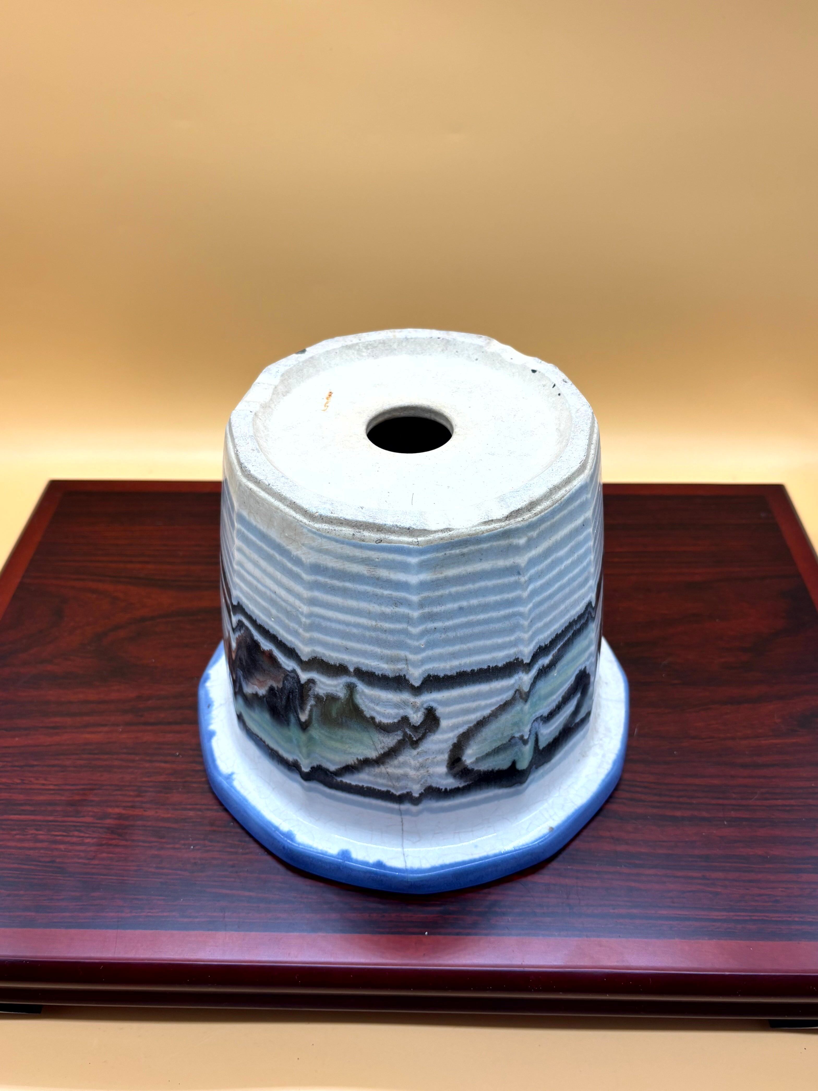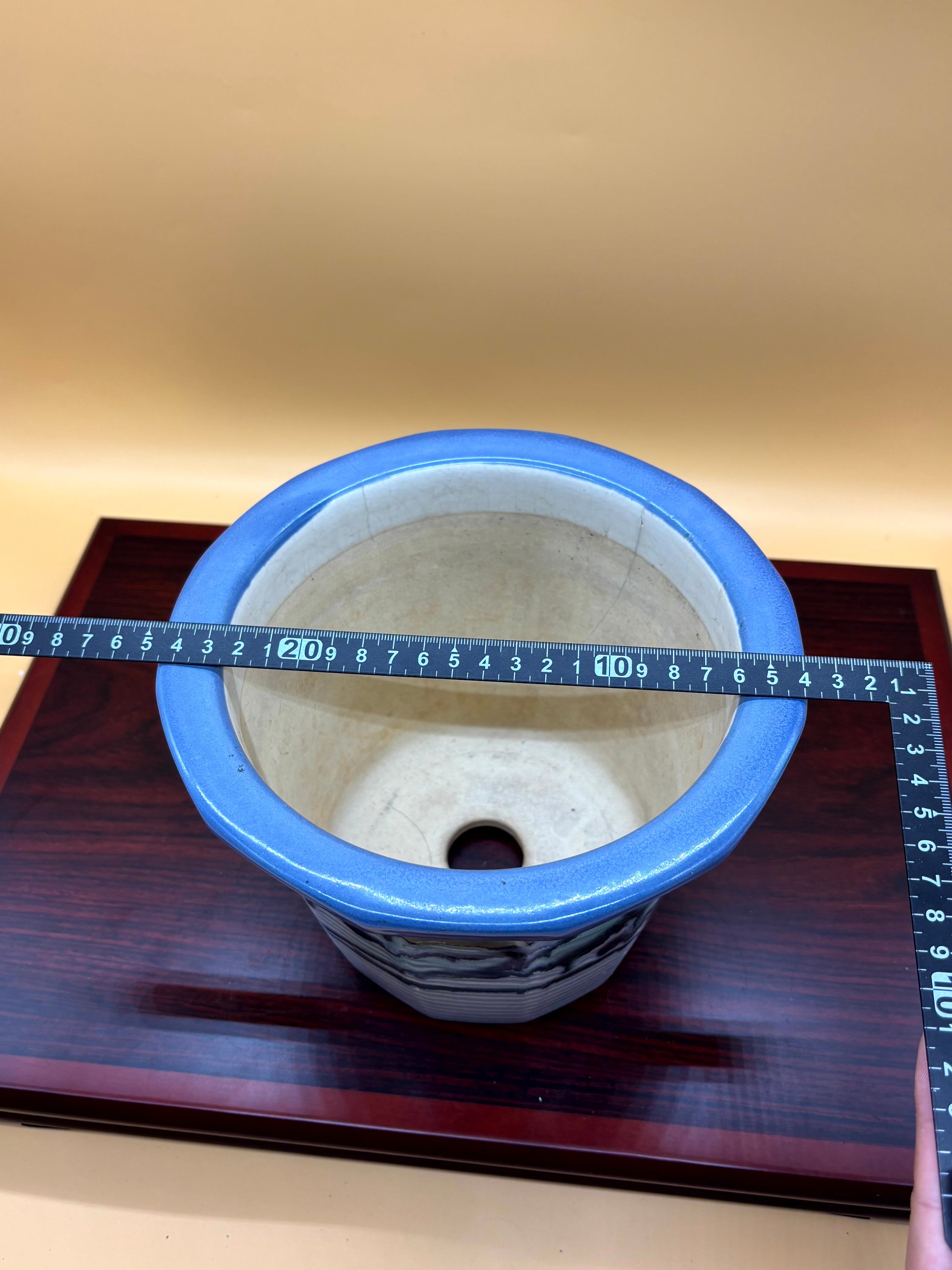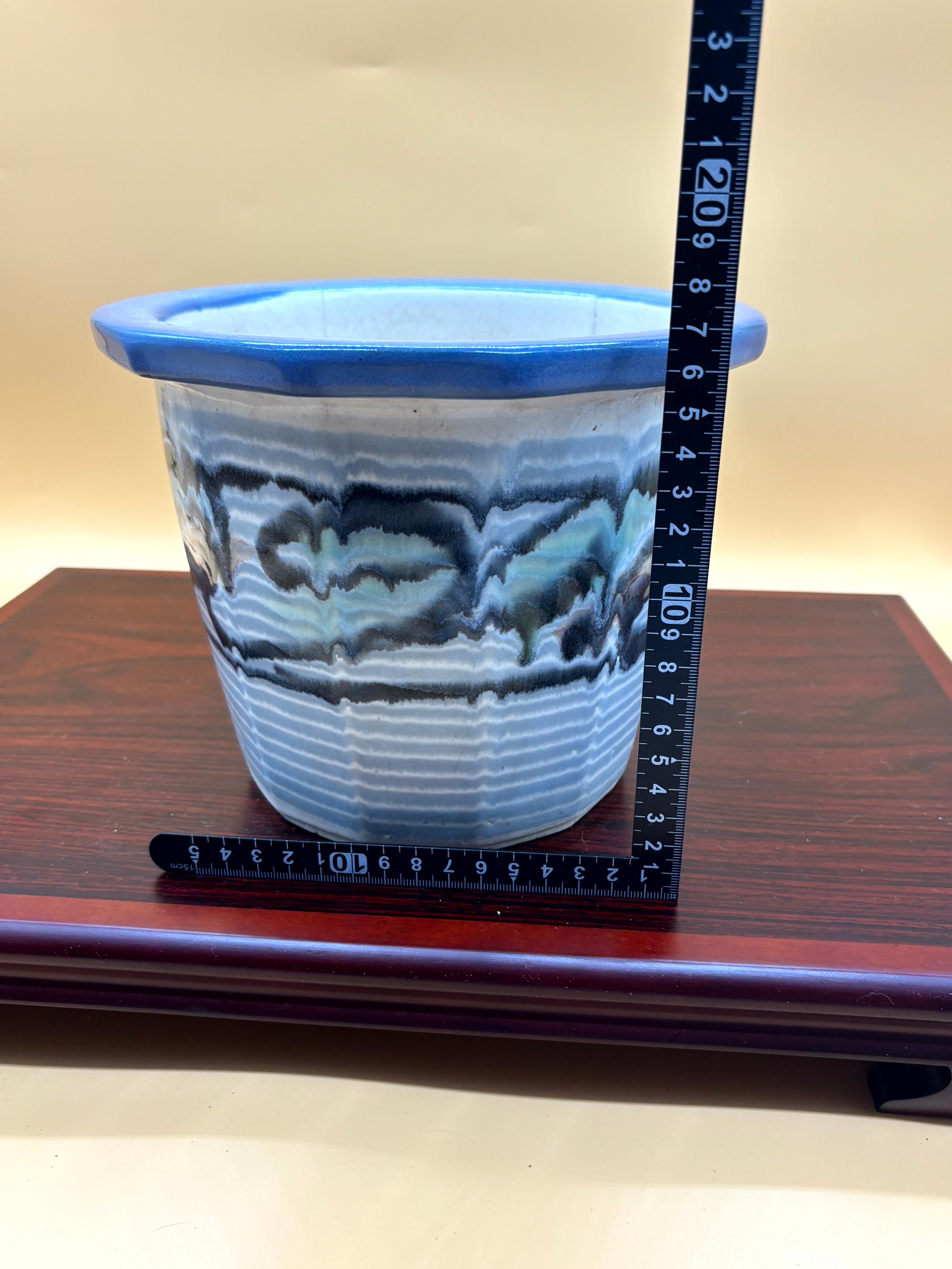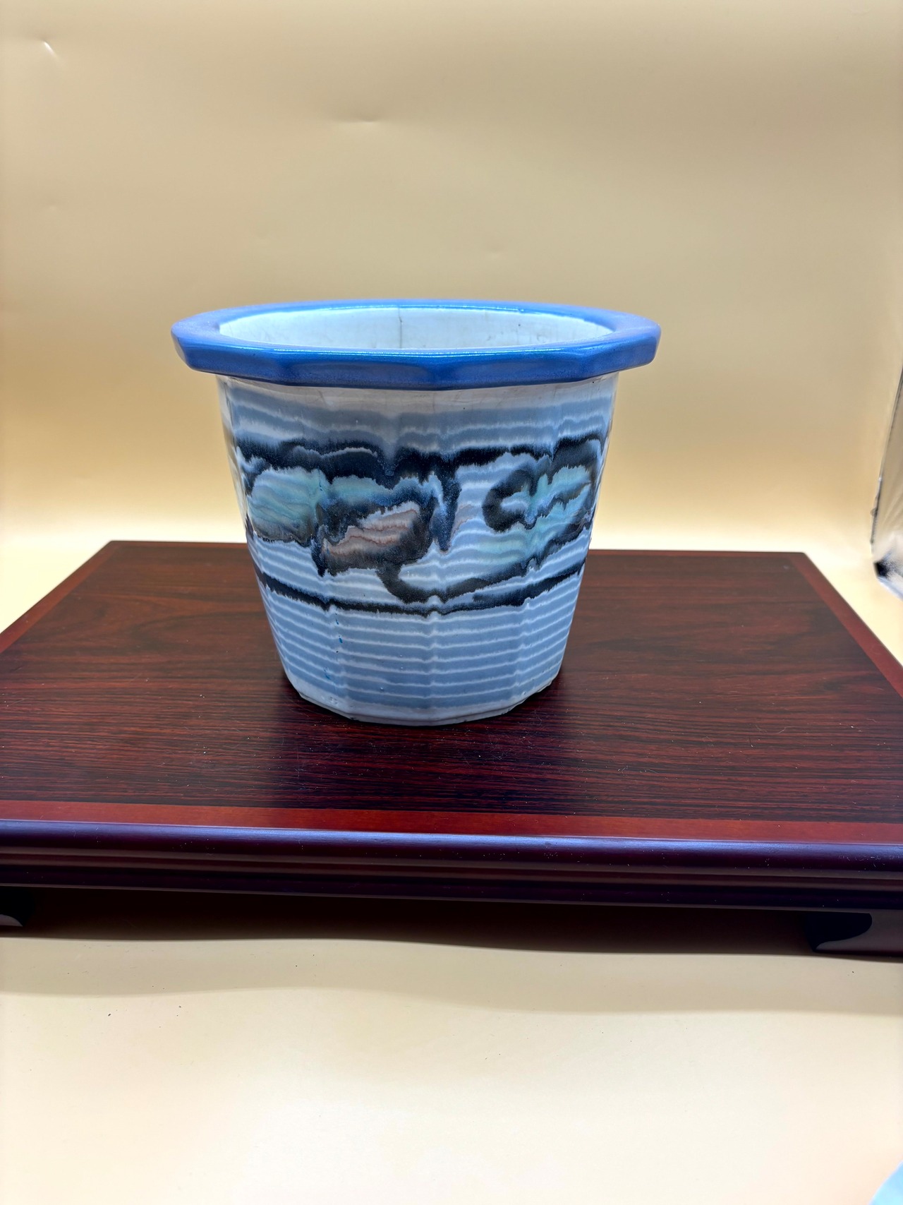 青と白のグラデーションが美しい円筒形の植木鉢。