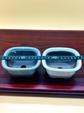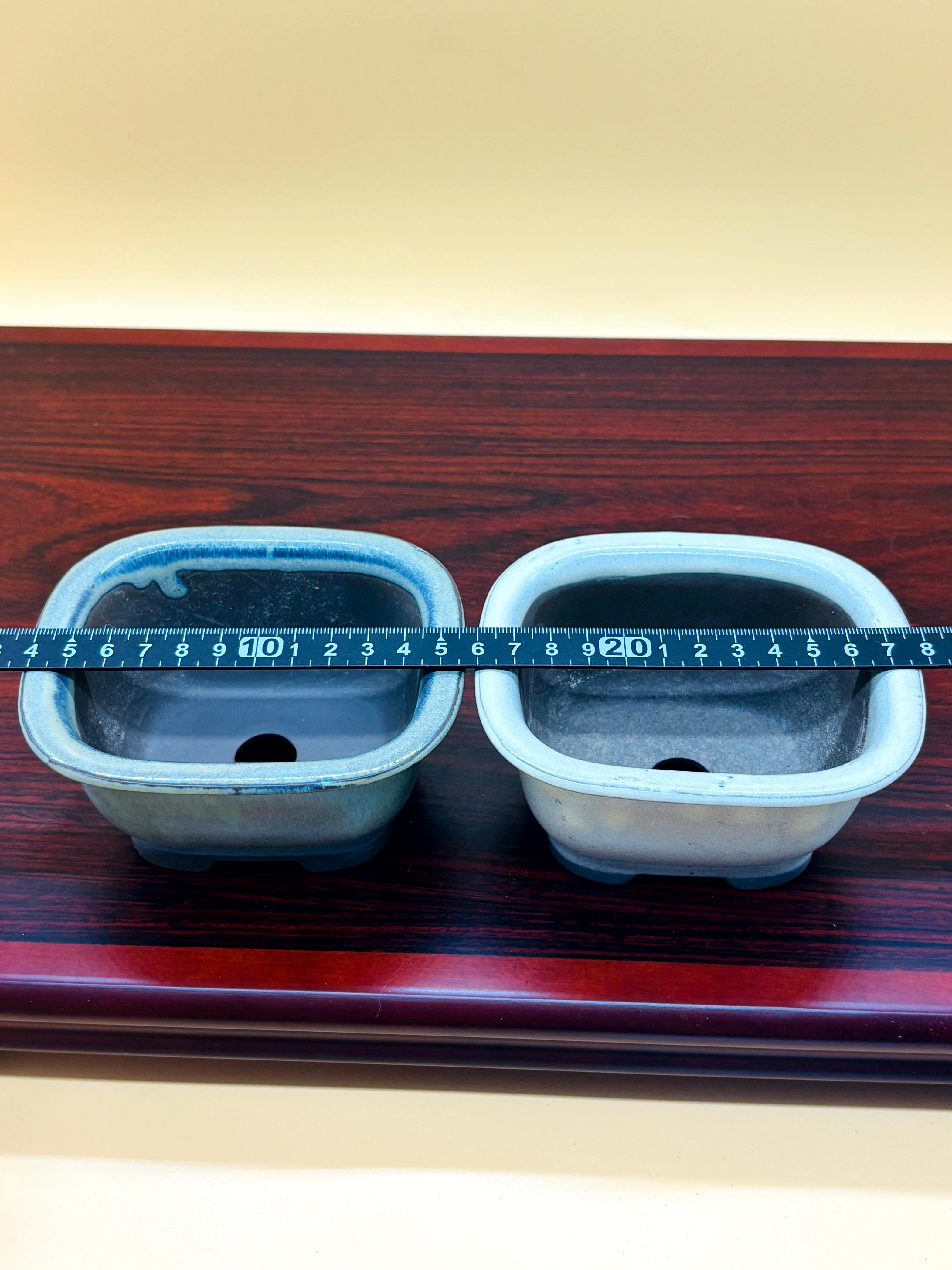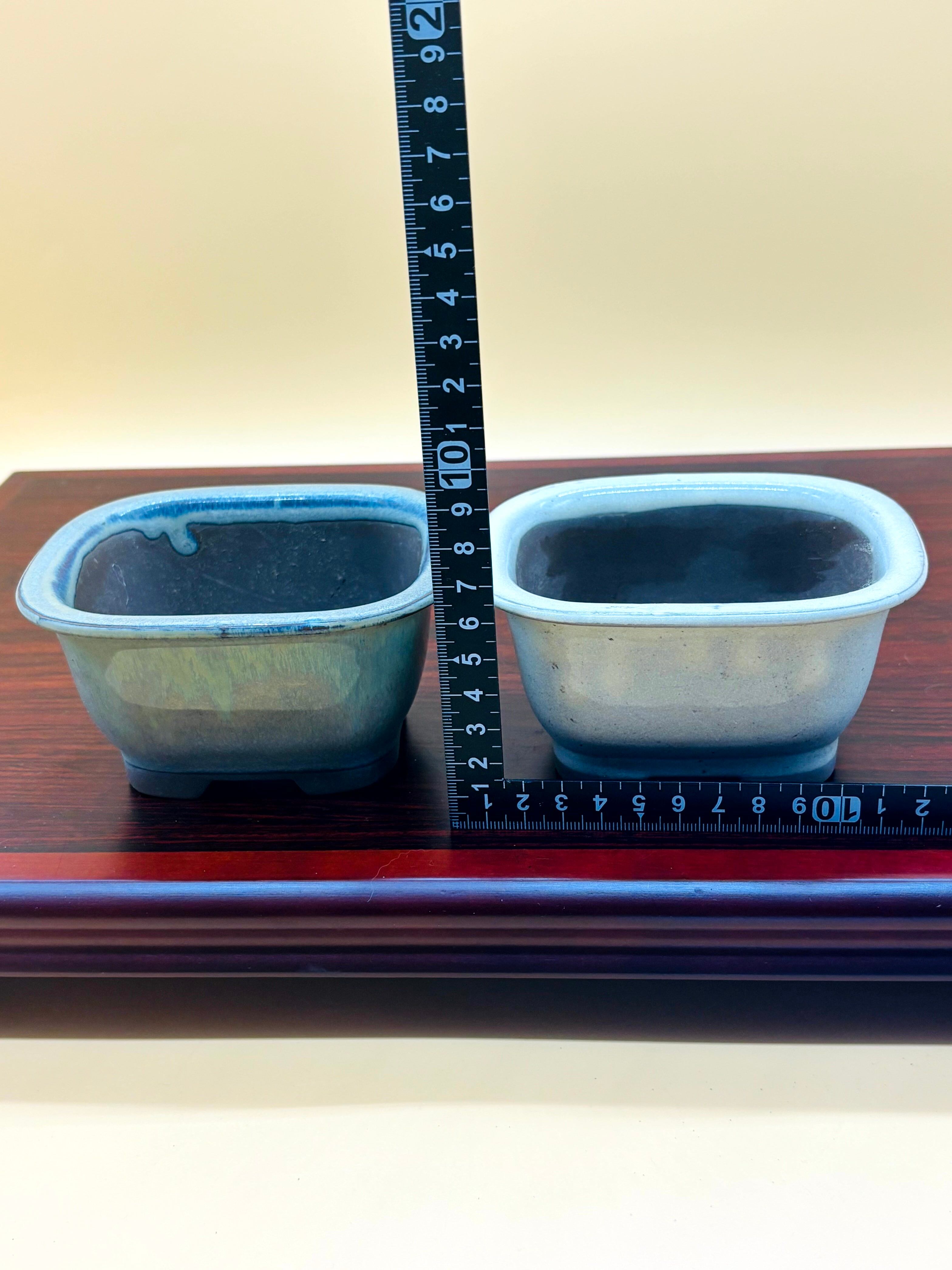 緑様グレーの陶器製四角形盆栽鉢2個セット。