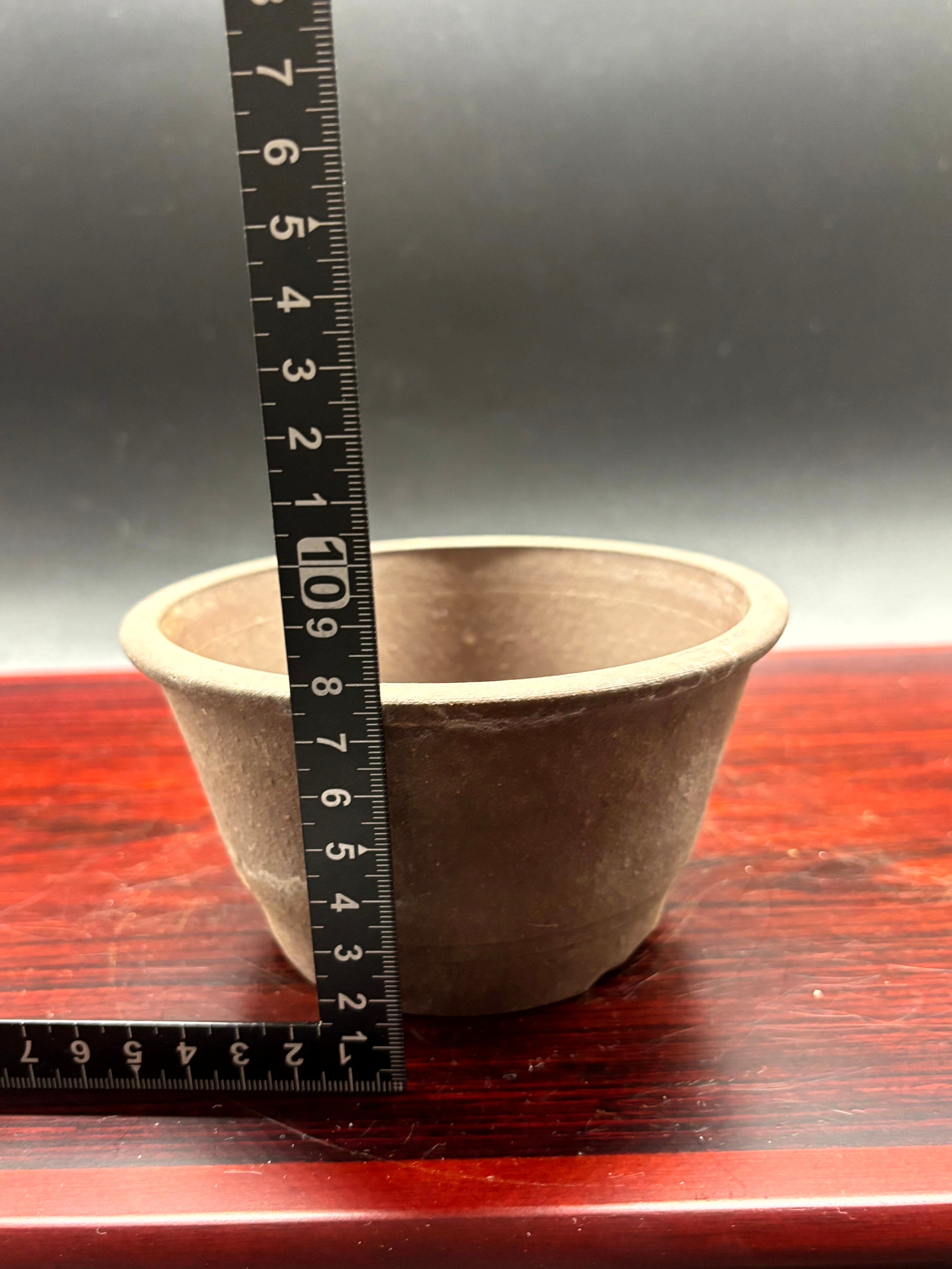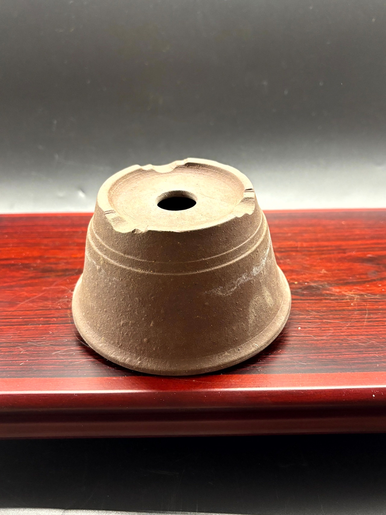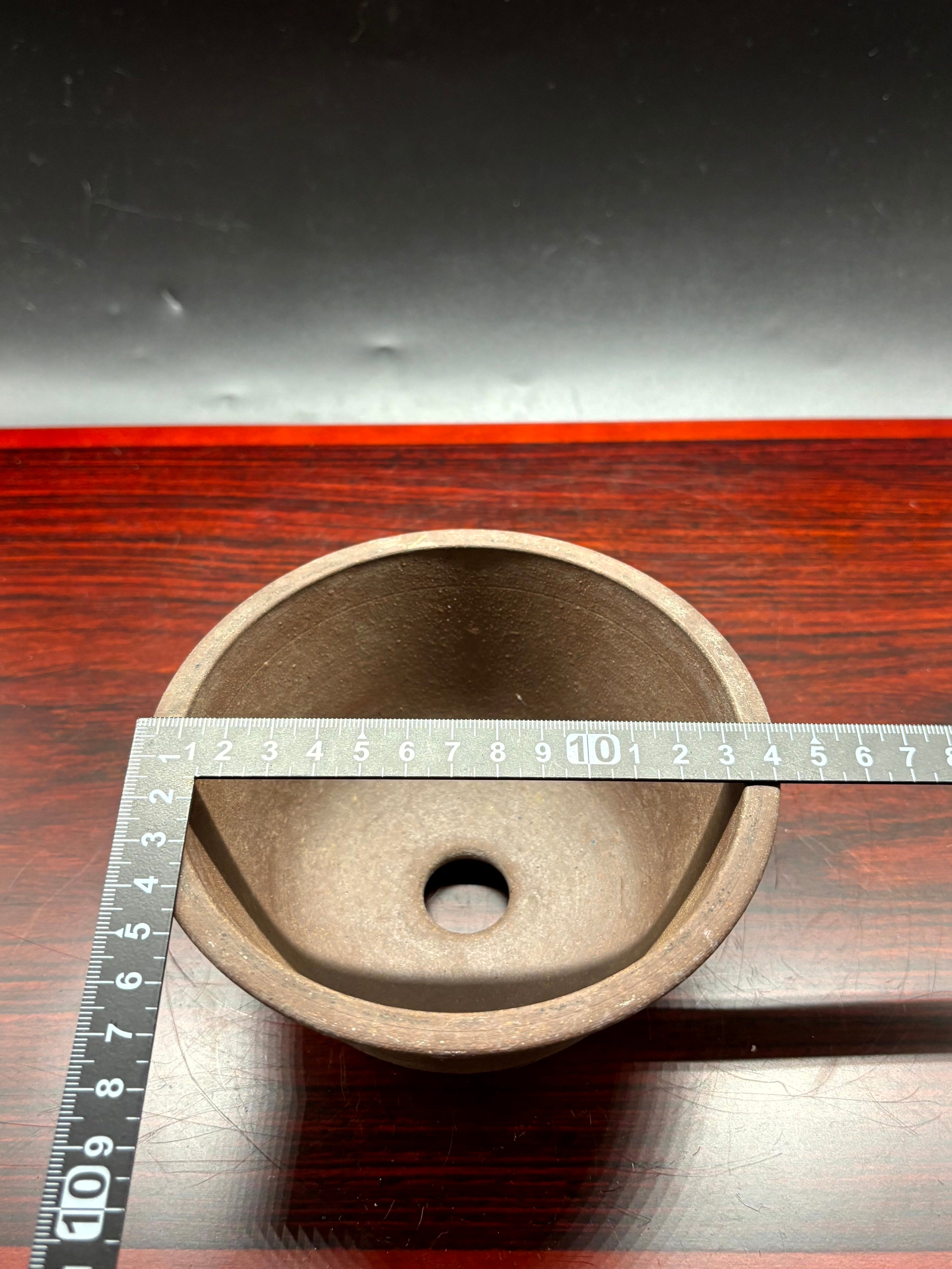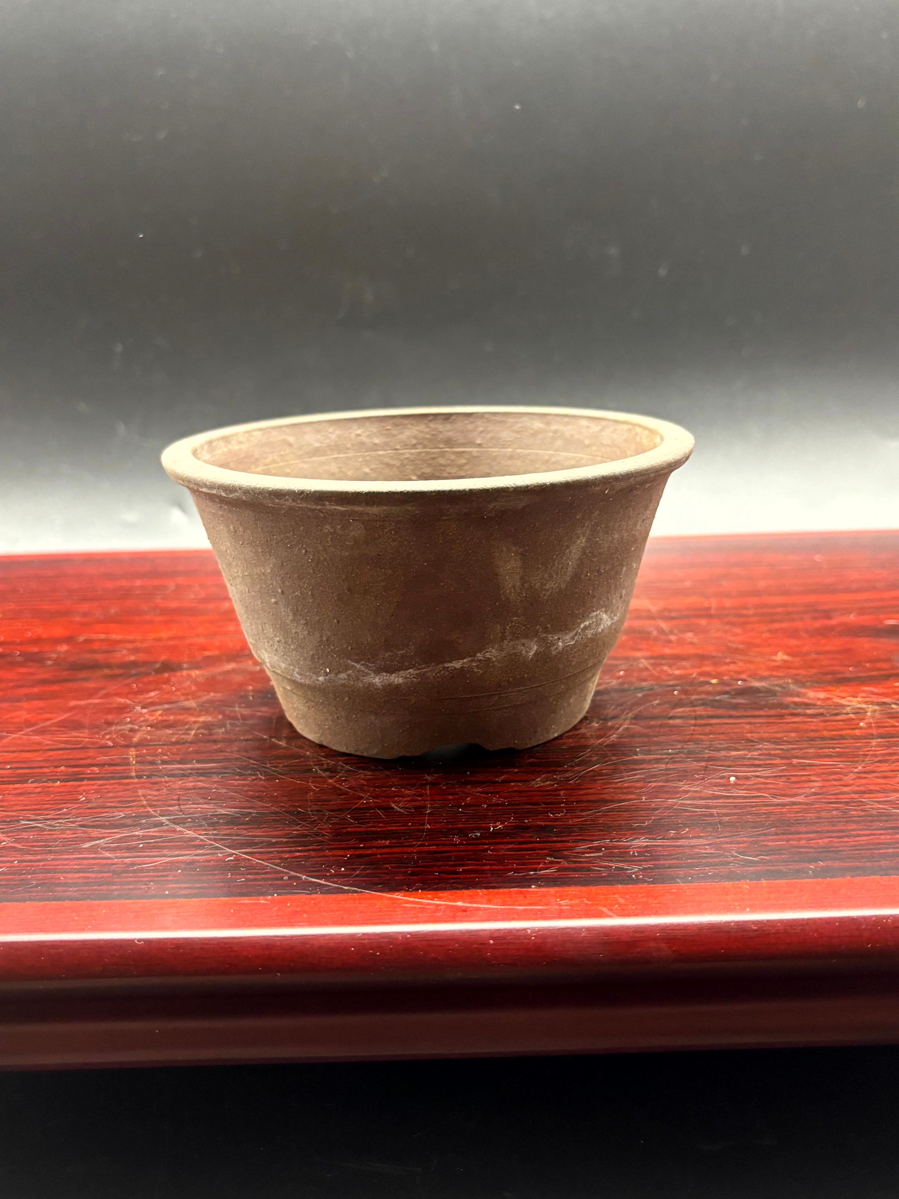 茶色の陶器製の小型盆栽鉢、底穴付きで排水性に優れています。
