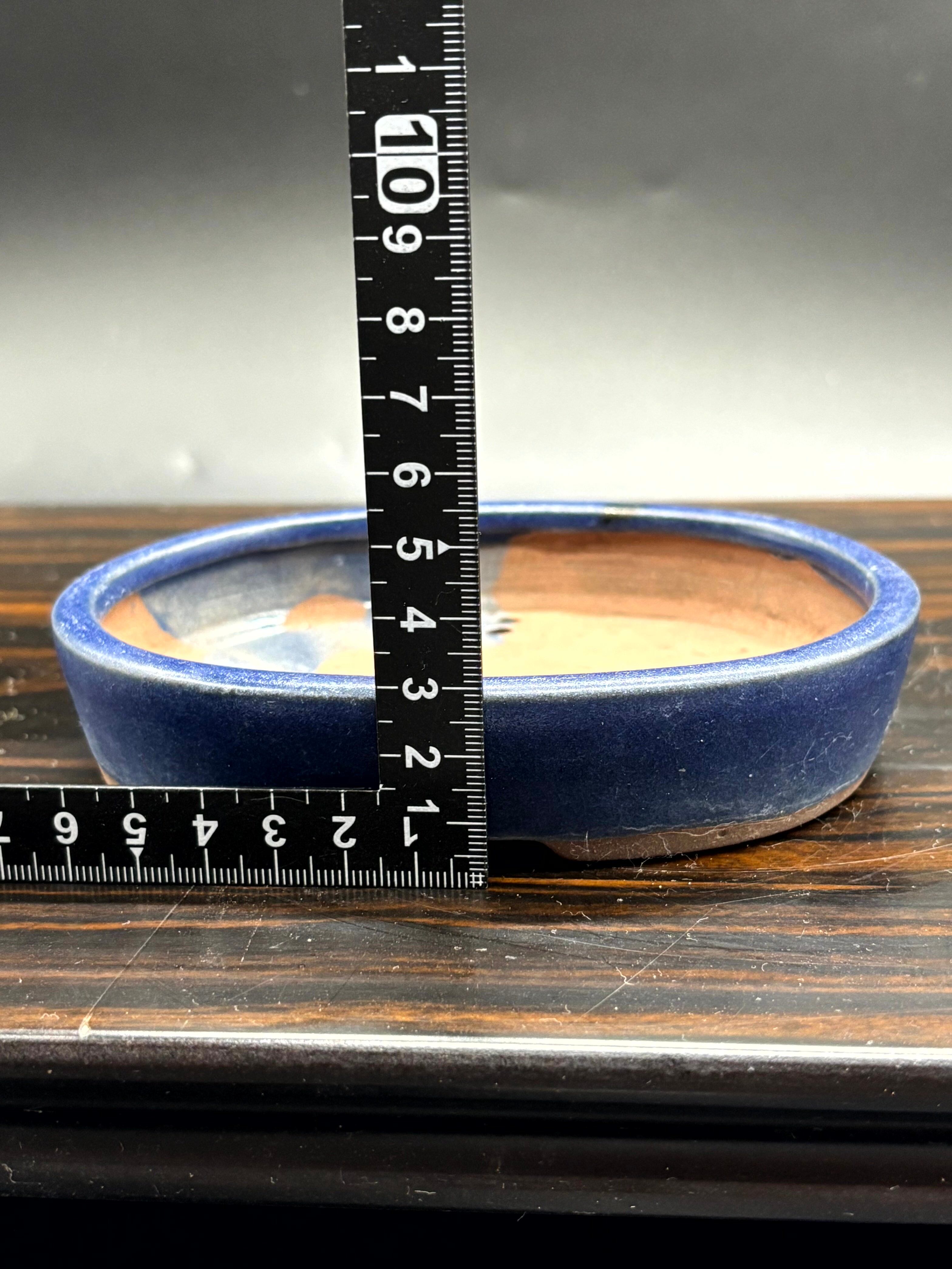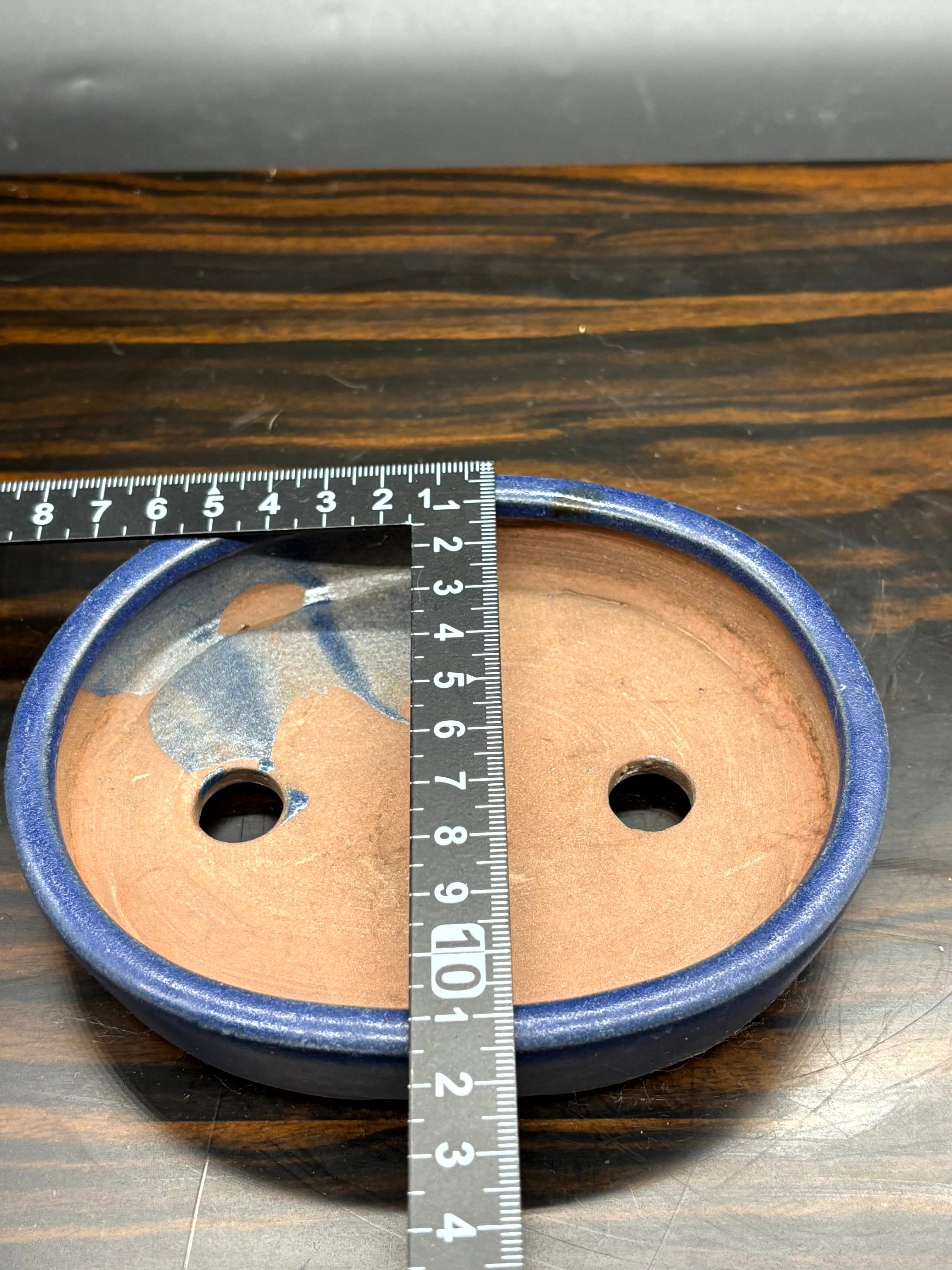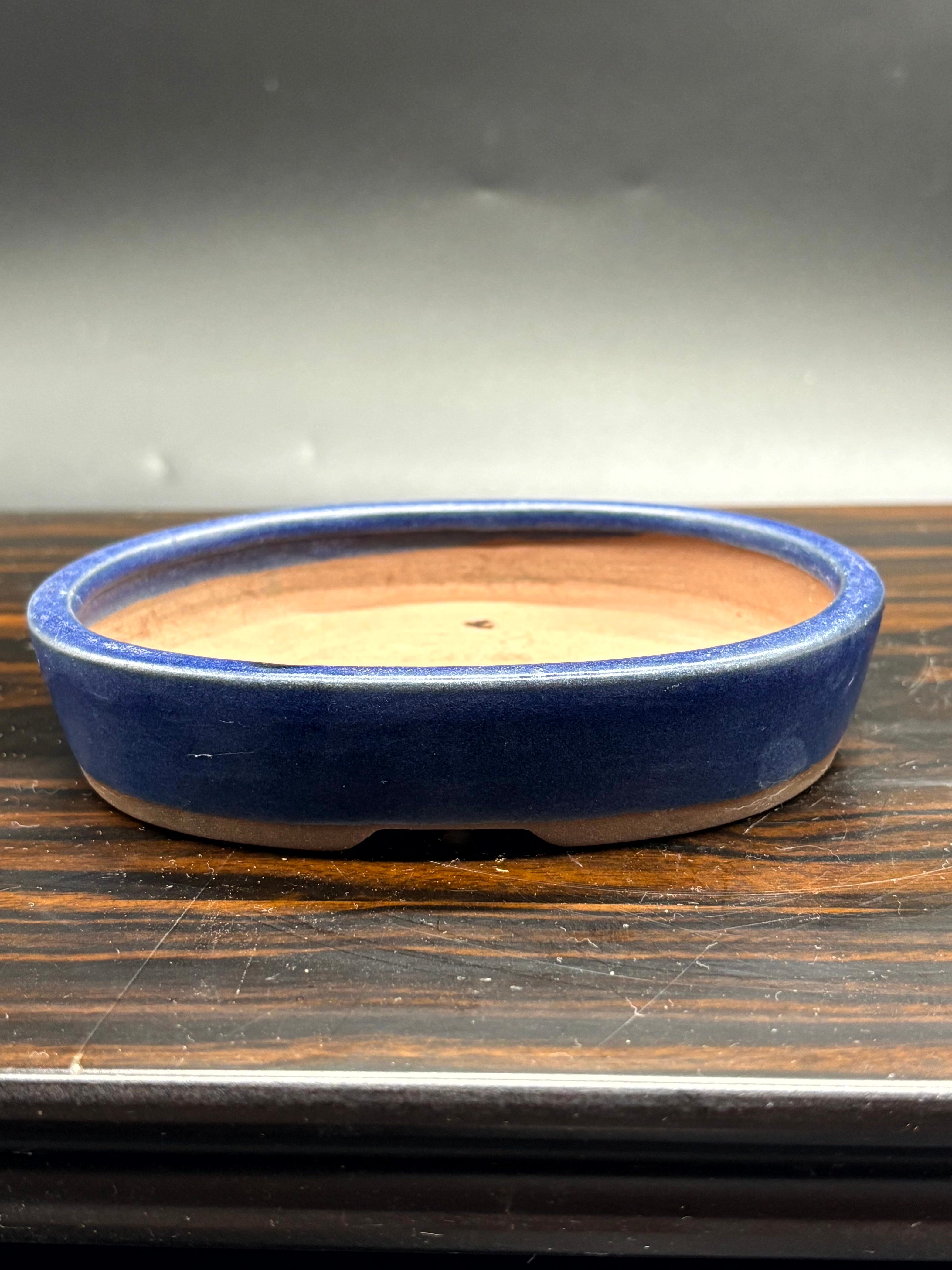 青い陶器製の楕円形盆栽鉢、排水穴付き。
