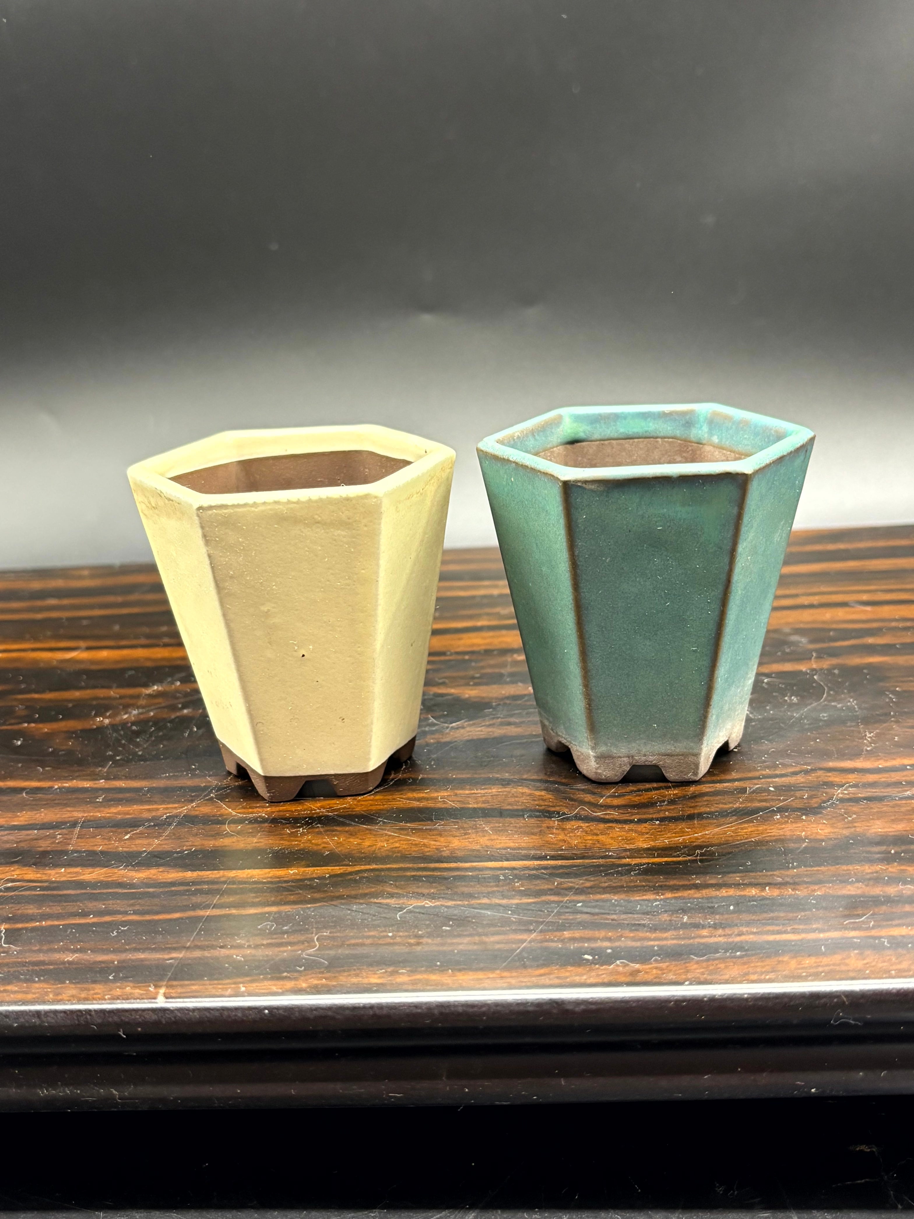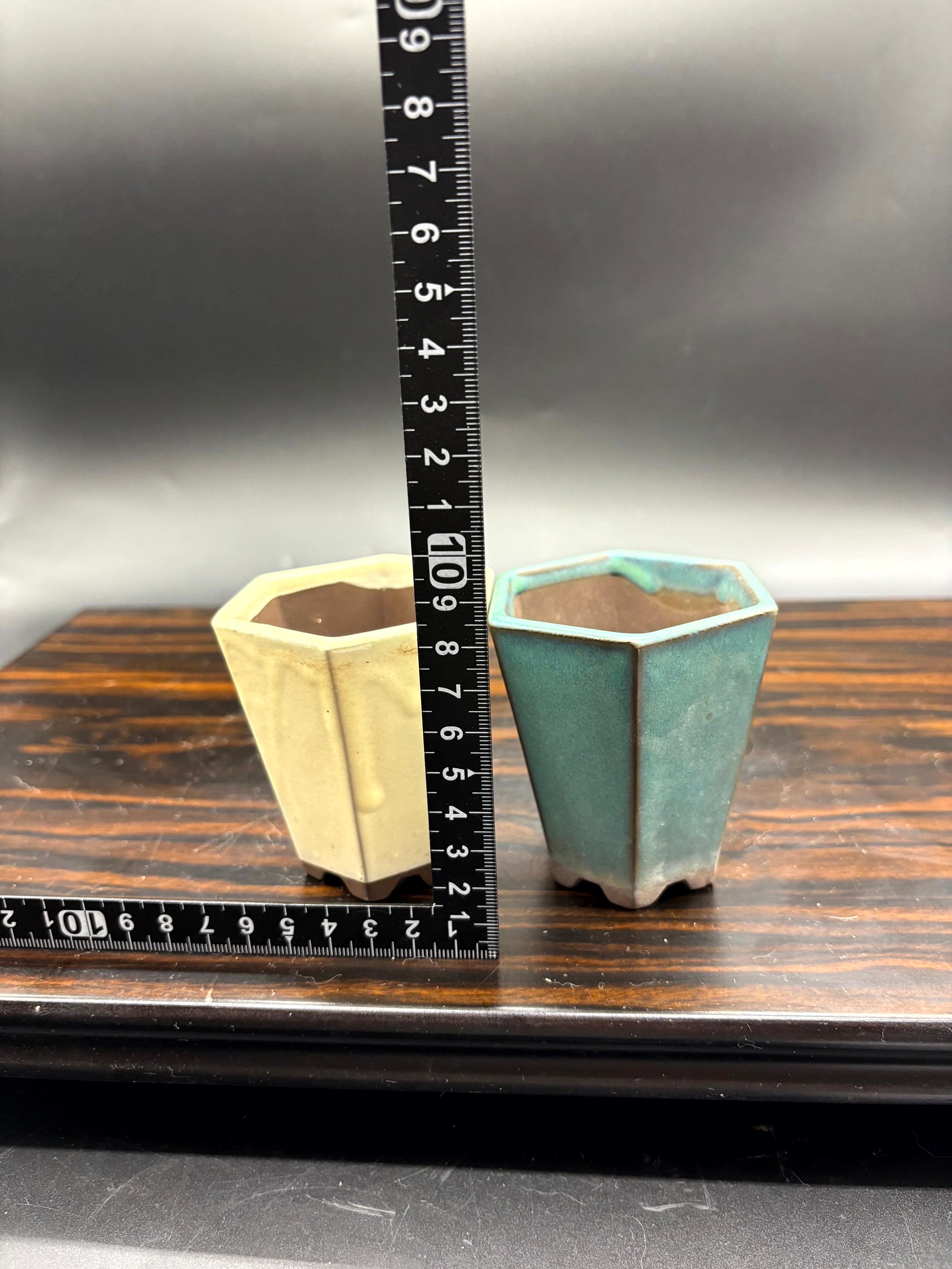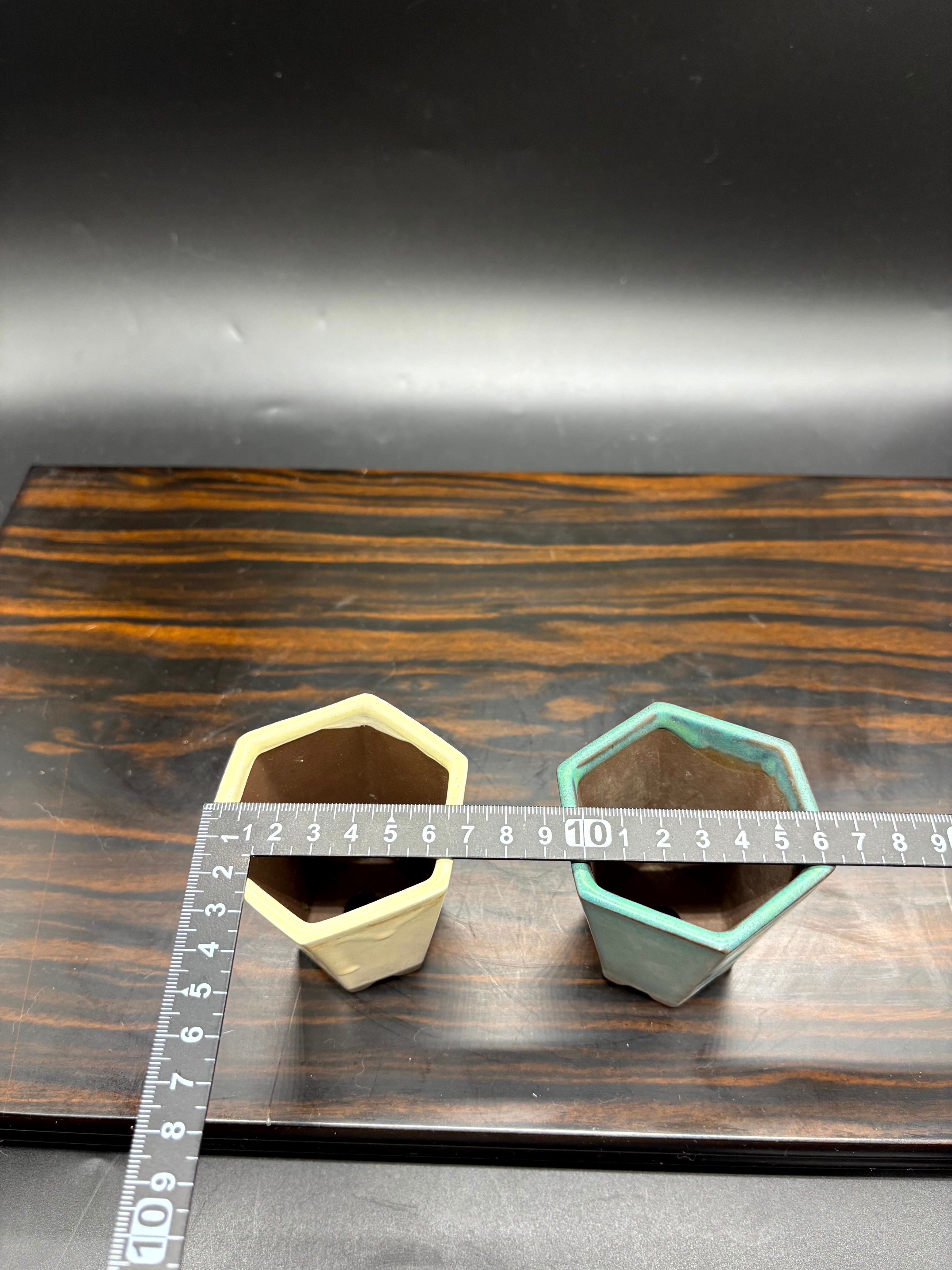 クリーム色と青緑色の六角形陶器鉢小型デザインです。