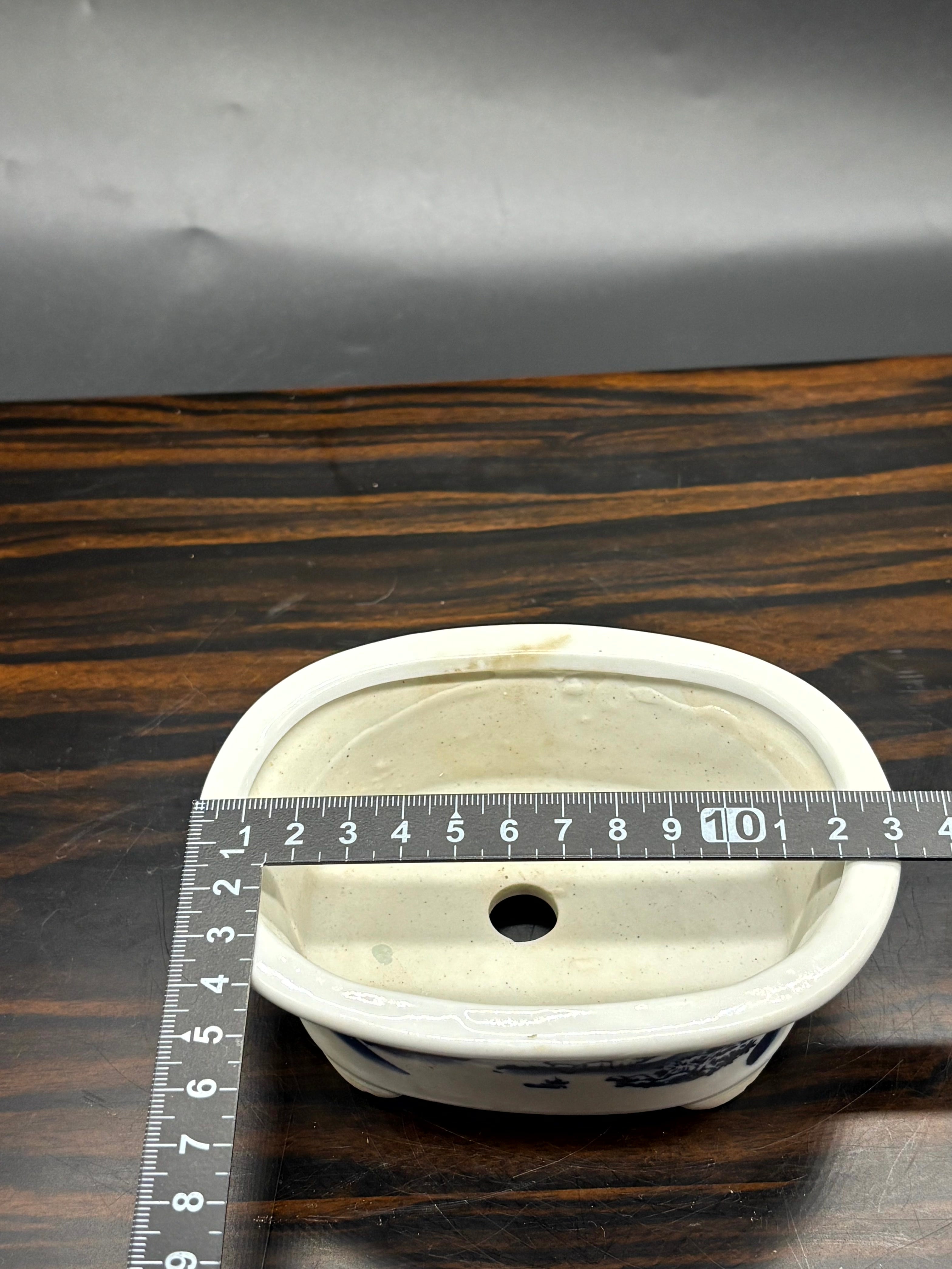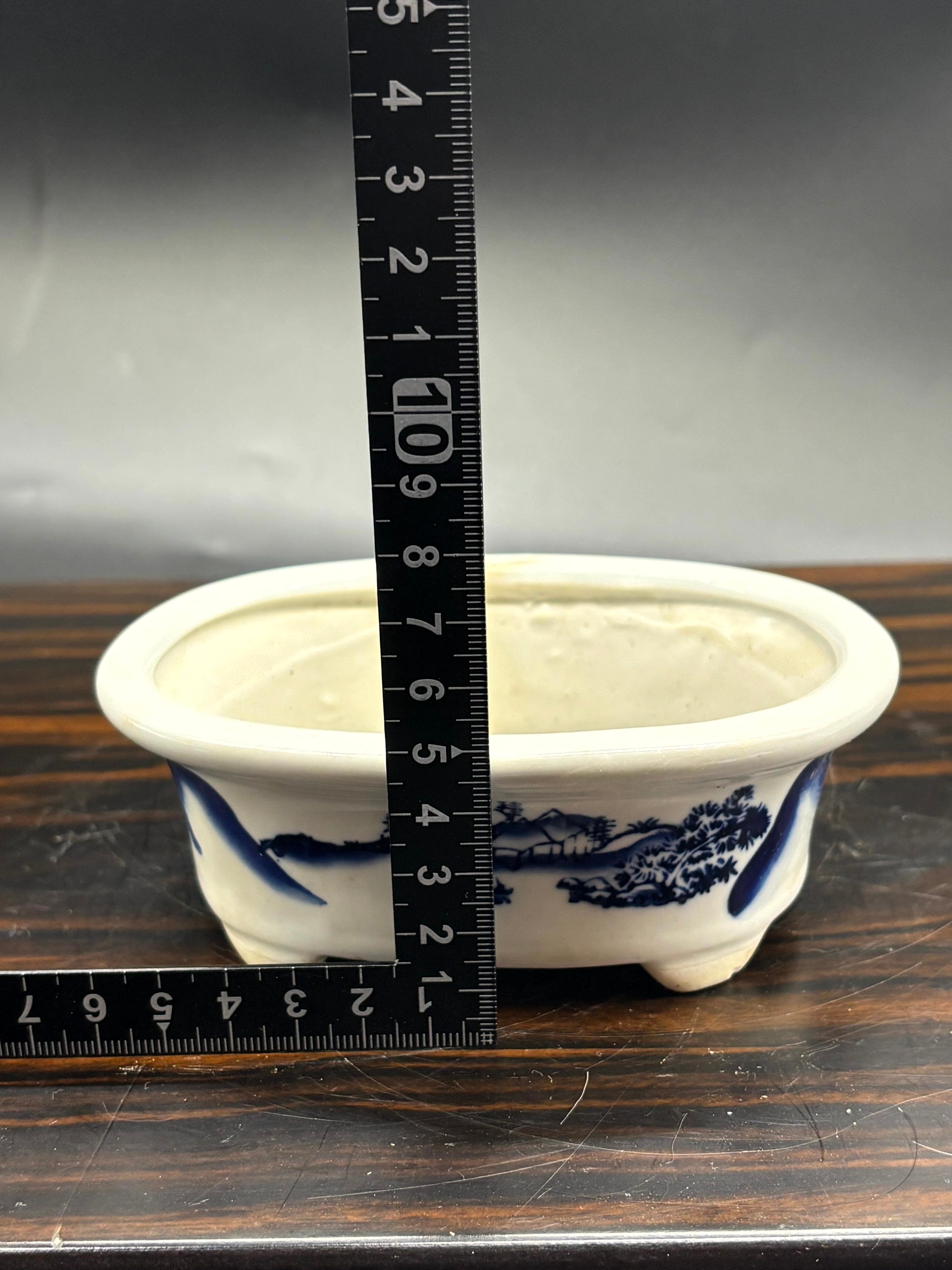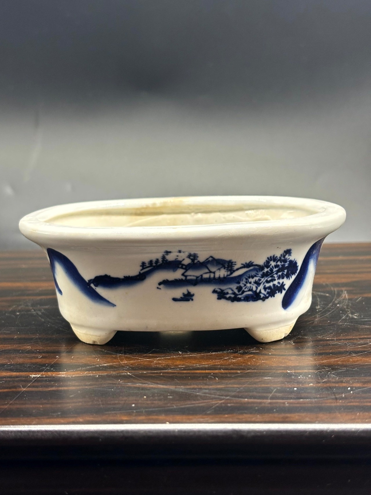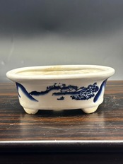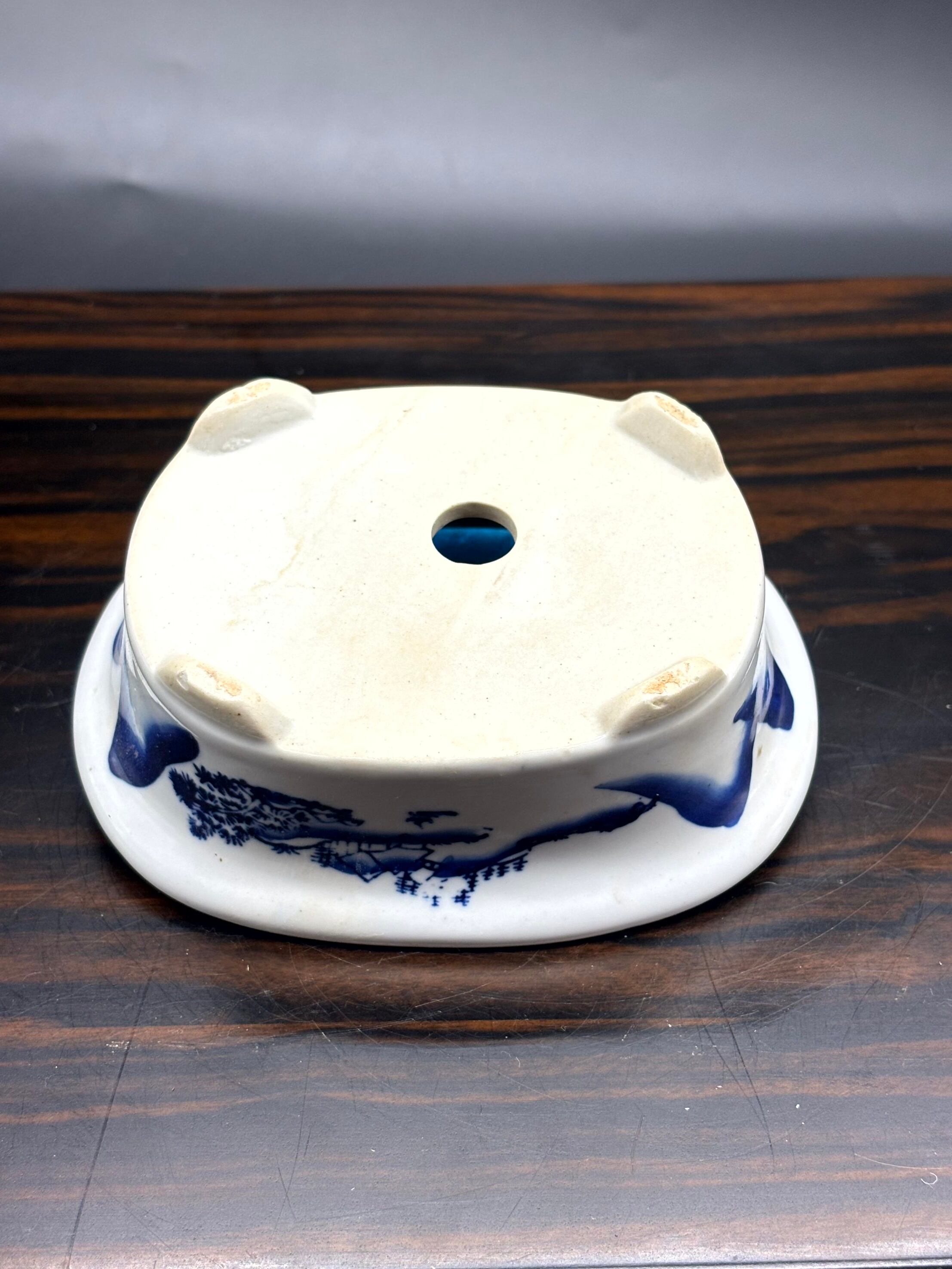 青い山と風景の絵柄が施された小型陶器盆栽鉢になります。