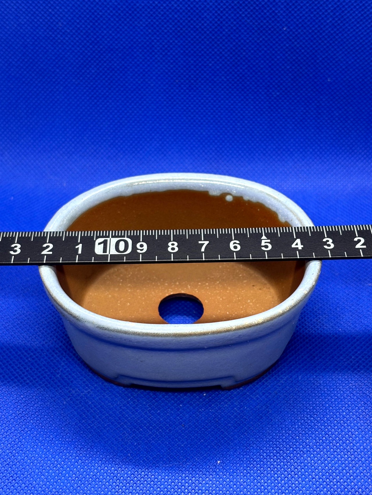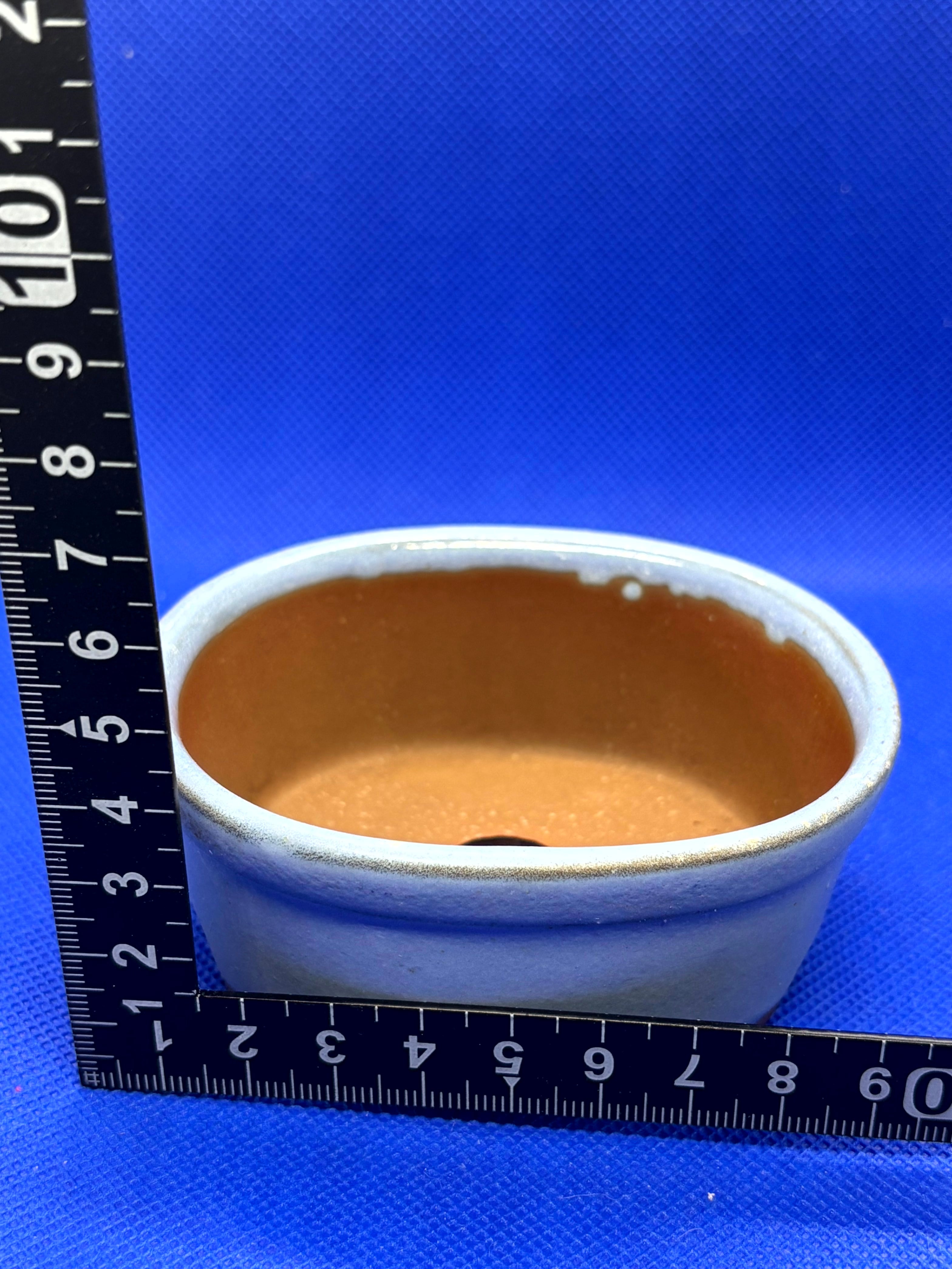 薄青色の楕円形の盆栽鉢になります。雑木などの盆栽におひとついかがでしょうか?